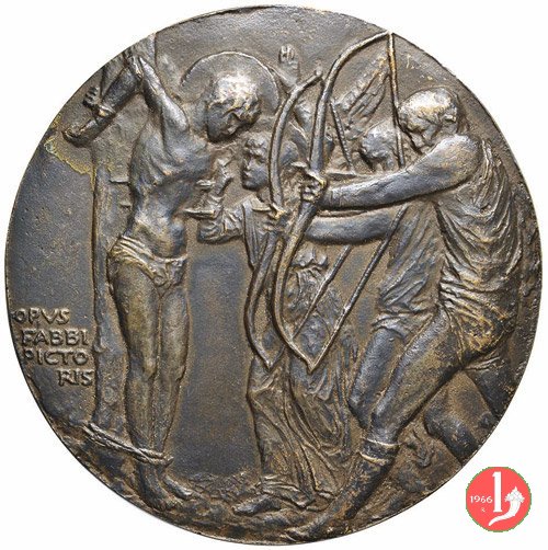 Dritto: Scena del martirio di San Sebastiano: il Santo nimbato e legato ad un albero, trafitto da frecce, viene consolato da angelo, deriso e mirato da due arcieri