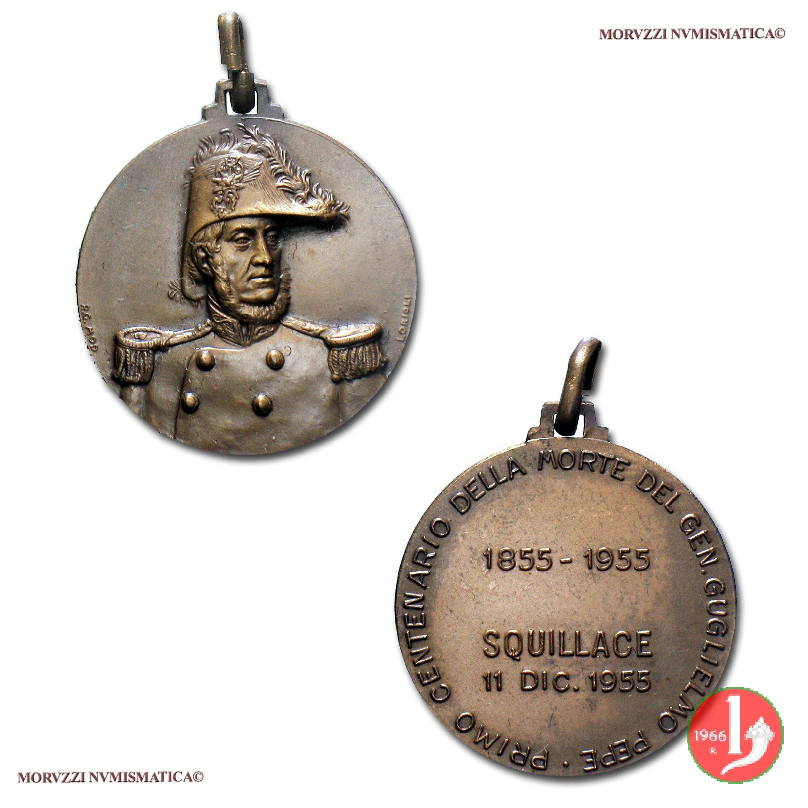 Squillace - 100° Gugliemo Pepe 1955 Dritto: Busto con divisa e cappello bicorno piumato a sx presso il bordo: R.G. MOD a dx presso il bordo: LORIOLI nel campo: 1855-1955 = SQUILLACE = 11 DIC. 1955 | |
