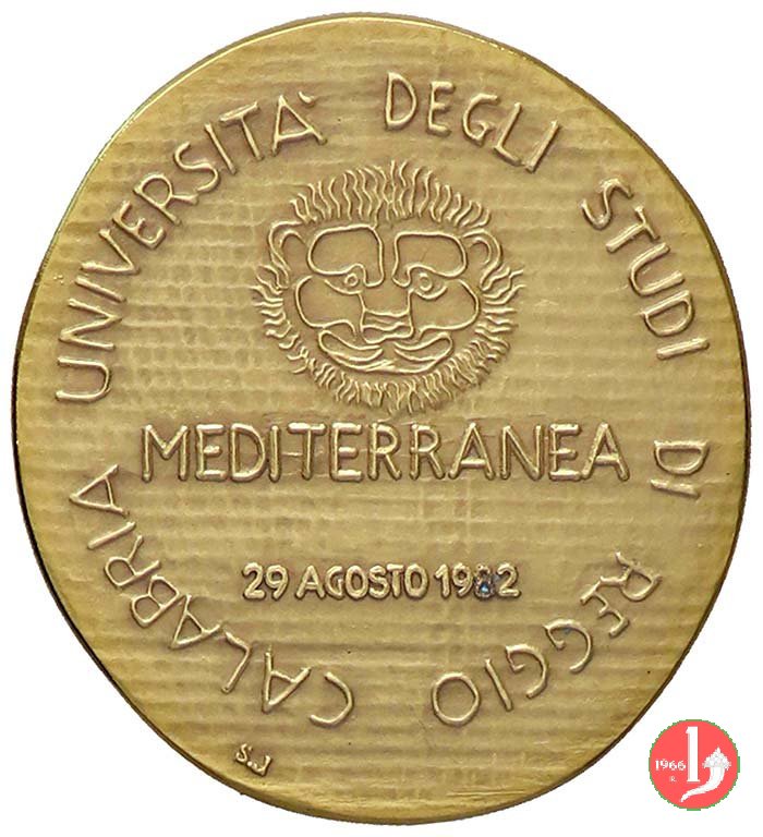 Università di Reggio Calabria 1982 Dritto: figura femminile nuda, volta sx e con fiori a dx, dietro al collo: GRECO in alto, al centro: testa di leone di fronte sotto: MEDITERRANEA nel campo: 29 AGOSTO 1982 in basso a sx: S.J | |