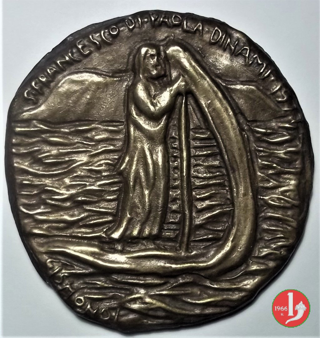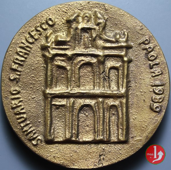 Santuario di San Francesco di Paola 1989 Dritto: San Francesco di Paola in piedi con due figure genuflesse e oranti a dx presso il bordo: GISMONDI Prospetto anteriore del Santuario | |