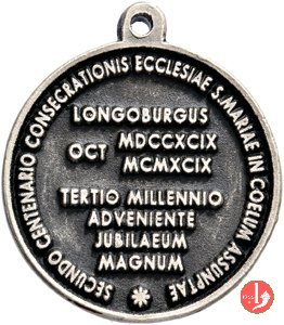 Longobucco -Madonna Nera dei Carbonai 1999 Dritto: MADONNA NERA DEI CARBONAI busto della B. V. Maria coronata ed orante col Bambino coronato in braccio sotto, circolarmente: GRUPPO LIGNEO • SEC. XIV. nel campo: LONGOBURGUS = OCT MDCCXCIX = MCMXCIX = TERTIO MILLENNIO = ADVENIENTE = JUBILAEUM = MAGNUM | |