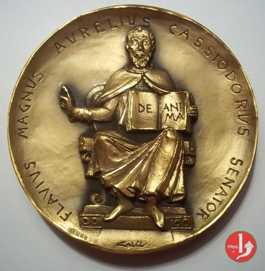 Cassiodoro - Monastero di Vivario Dritto: FLAVIUS AURELIUS CASSIODORUS SENATOR Cassiodoro seduto in trono di fronte regge libro aperto su cui: DE _ ANI = MA in basso, a sx: JOHNSON in basso in corsivo: GRILLI | |