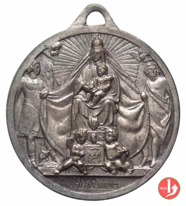 Verso: La B. V. Maria raggiante e coronata, regge il Bambino, seduta in trono tra due angeli che reggono il mantello e con due Cherubini alla base che reggono lo stemma con il monogramma MA
