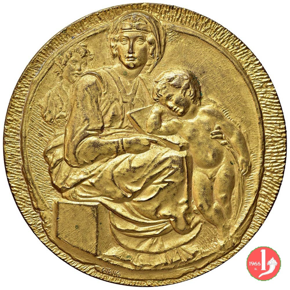 Dritto: riproduzione del bassorilievo del Tondo Pitti: la B. V. Maria velata, seduta a dx e volta di fronte, regge bambino in piedi