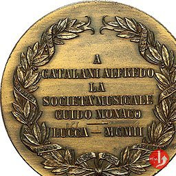 Verso: entro rami d'alloro cerchiati da nastro recante le opere del Maestro Catalani ELDA _ DEJANICE _ EDNEA _ LORELEY _ VALLY _ ERO E LEANDRO, legato in basso 1854 _ 1893 : A = CATALANI ALFREDO = LA = SOCIETA' MUSICALE = GUIDO MONACO = - = LUCCA - MCMII