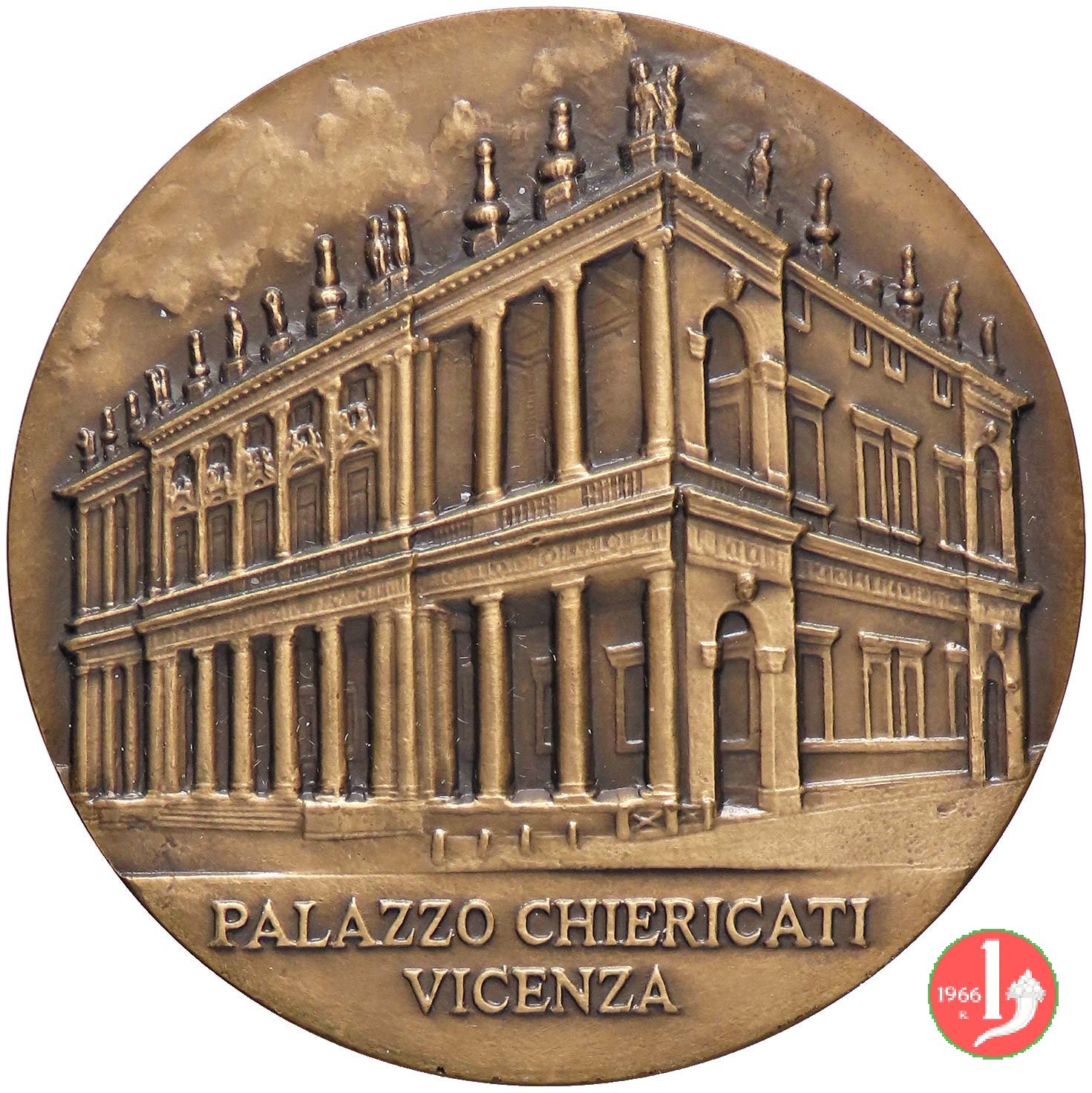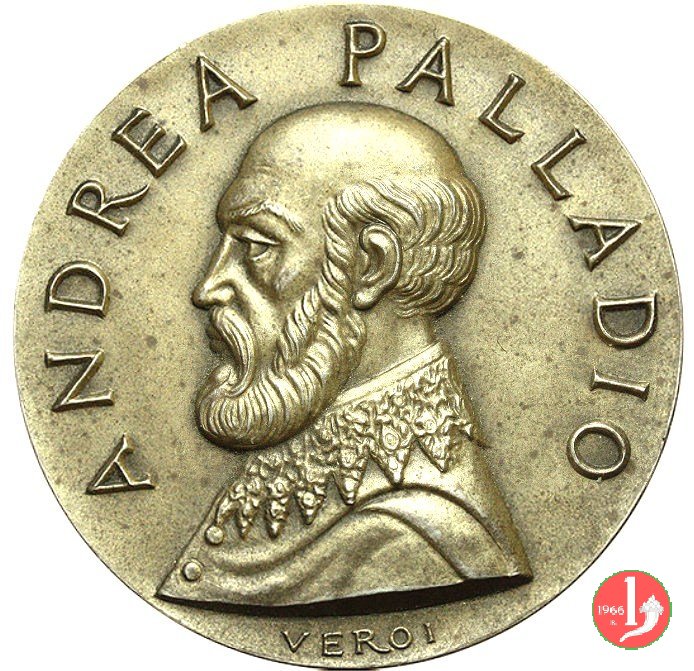 Anno Palladiano 1973 Dritto: ANDREA _ PALLADIO busto a sx con abito dal colletto in pizzo sotto: VEROI Prospetto anteriore di Palazzo Chiericati a Vicenza sotto la base, a dx: JOHNSON | |