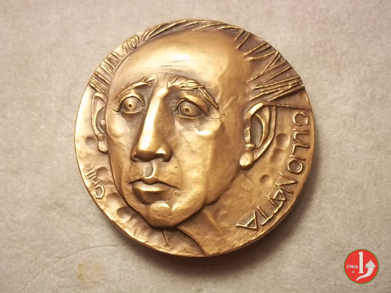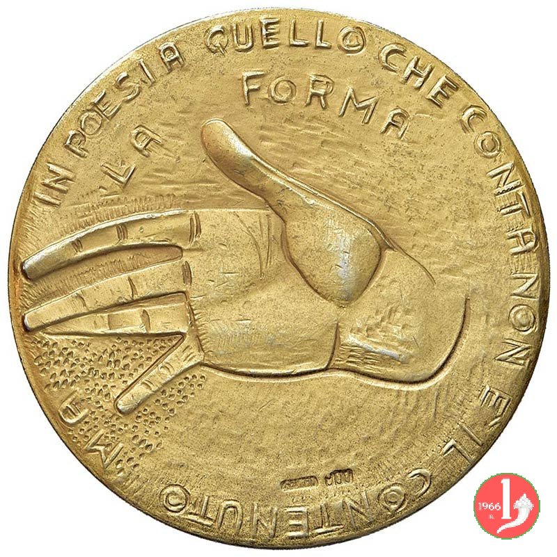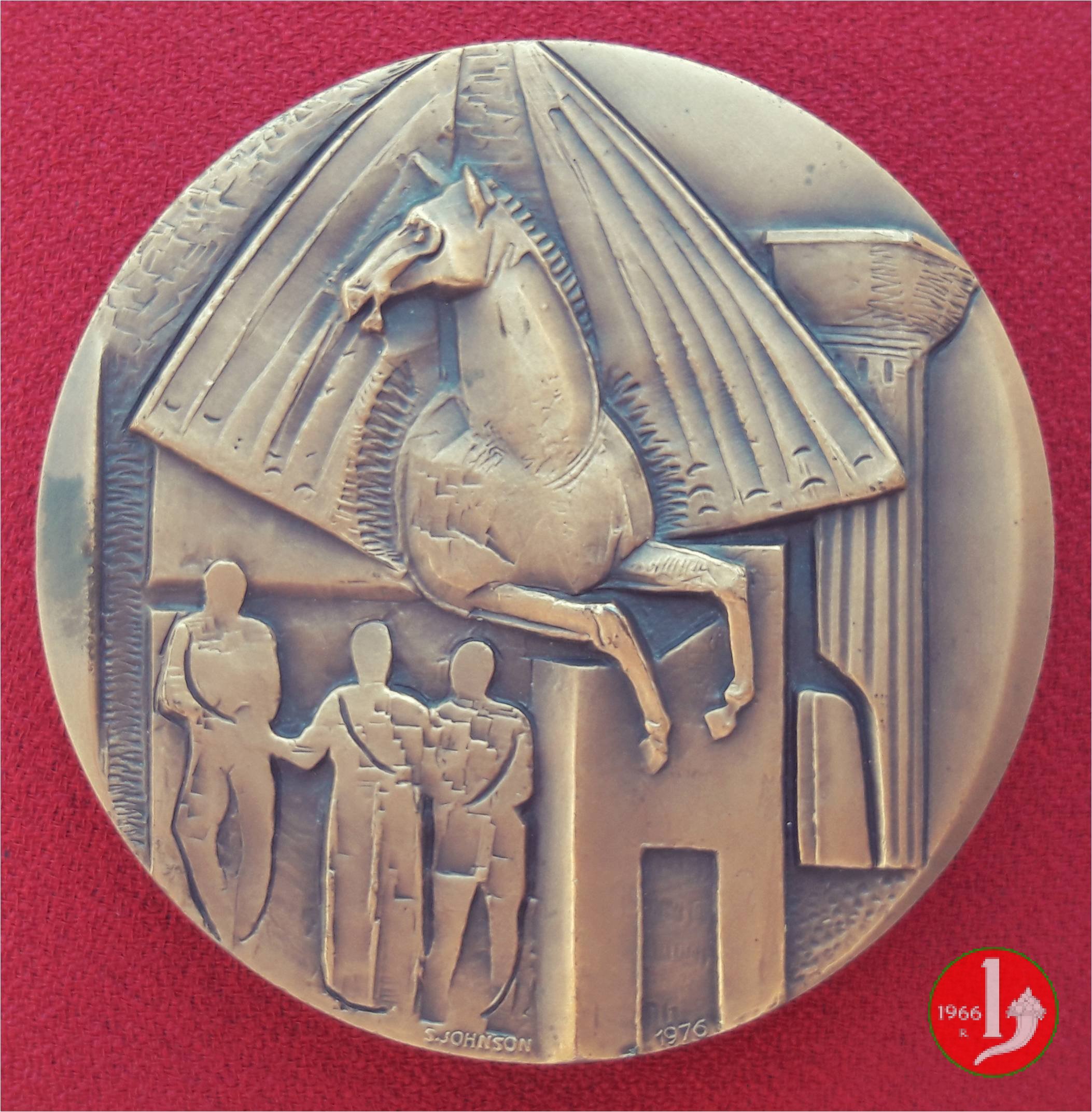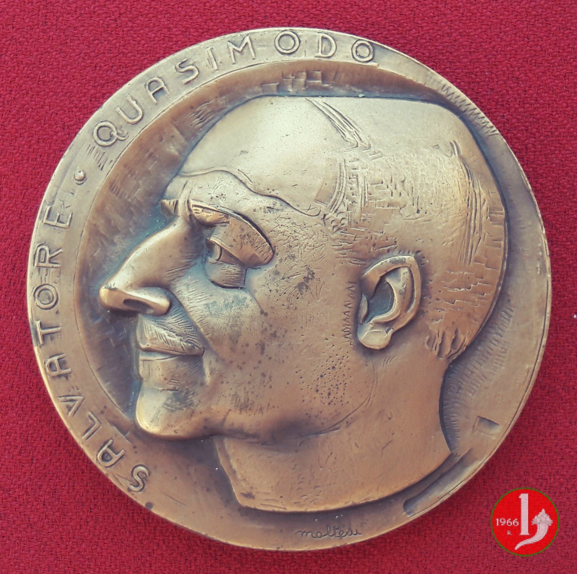 Salvatore Quasimodo (1959) Dritto: Intorno la scritta "SALVATORE • QUASIMODO" Al centro, testa che guarda a sinistra; In basso "MOLTENI" Verso: Testa di cavallo tra due teli triangolari, su casa; In basso tre figure in piedi di spalle; Sullo sfondo, a dx: colonna dorica; In basso vicino al bordo "JOHNSON" "1976". | |
