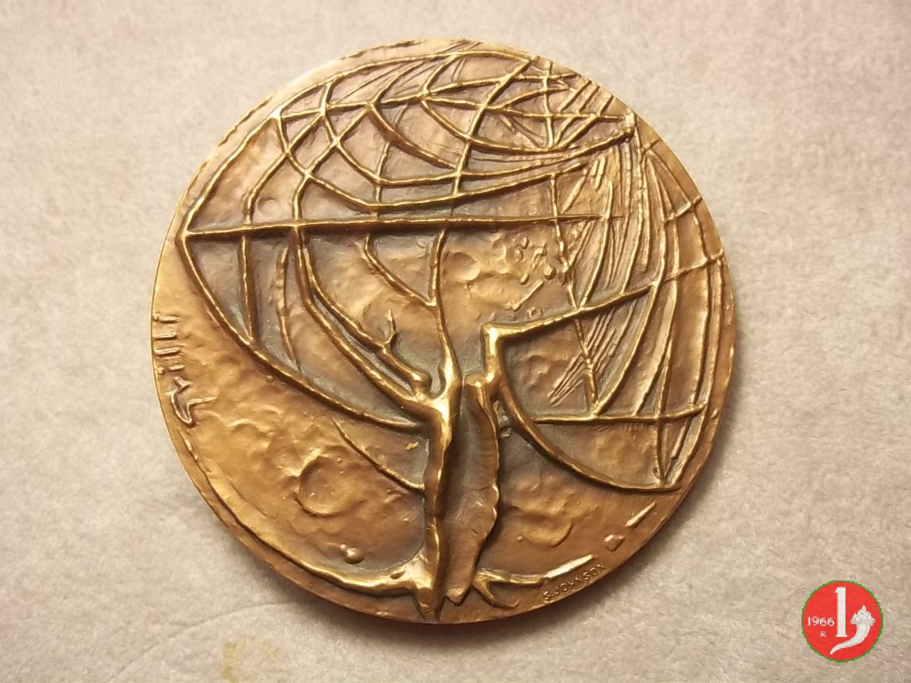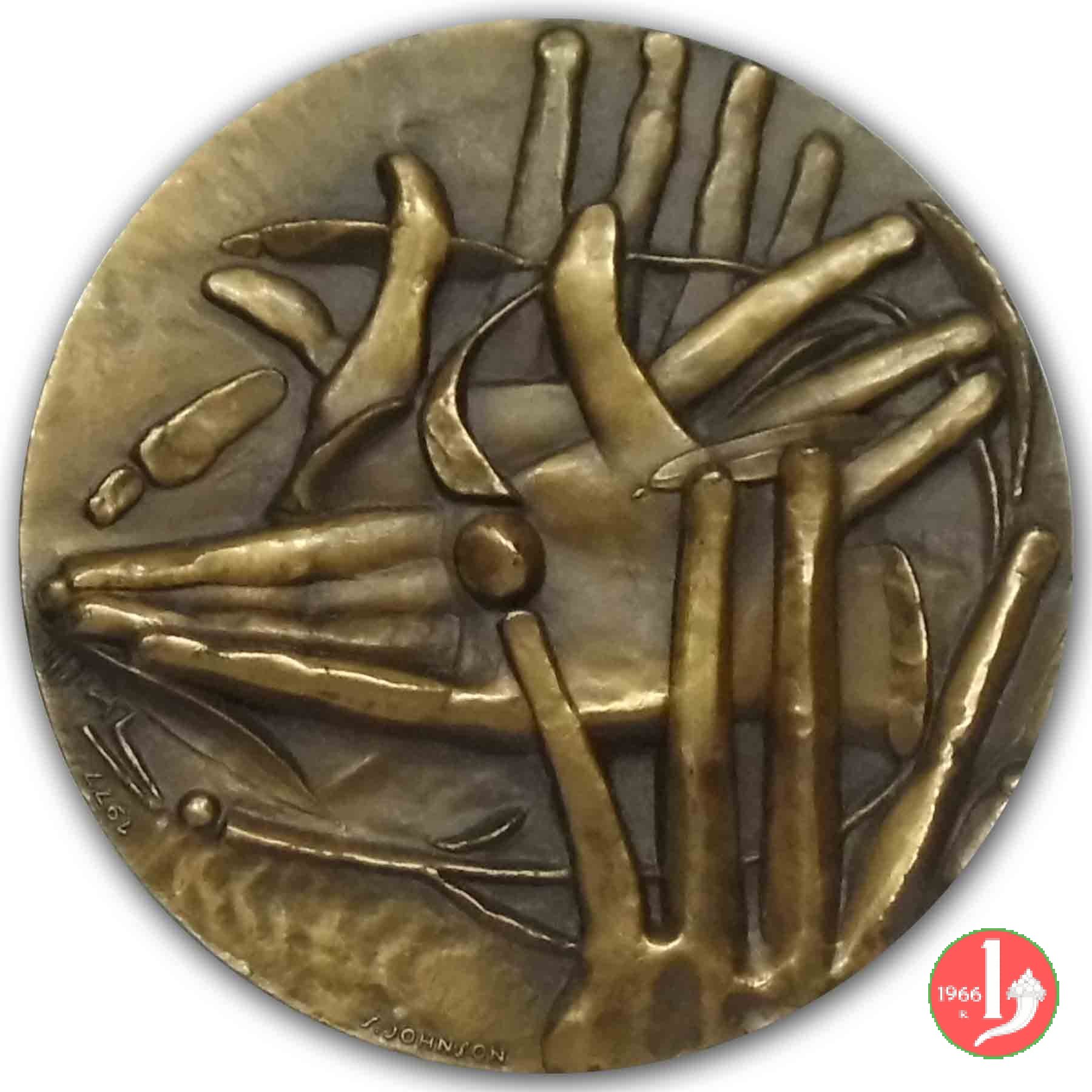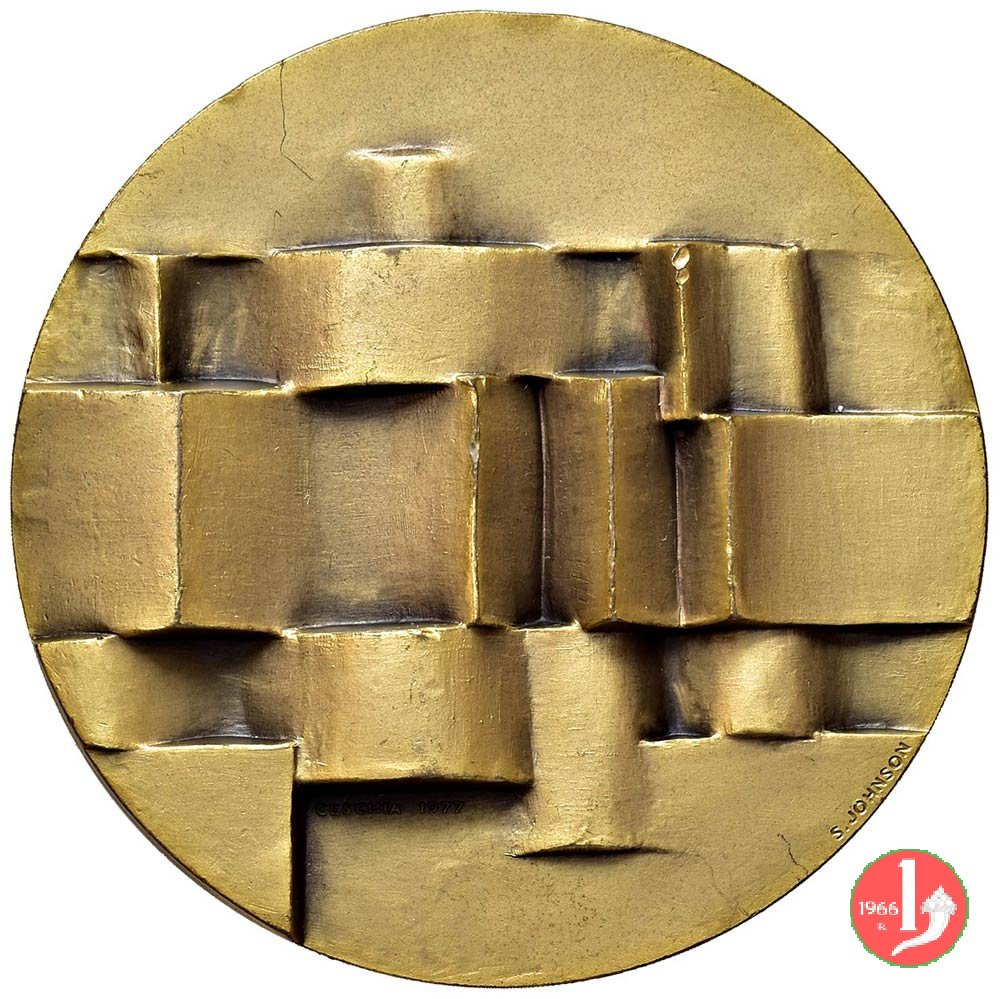 Salvatore Quasimodo (1959) Dritto: Intorno la scritta "SALVATORE • QUASIMODO" Al centro, testa che guarda a sinistra; In basso "MOLTENI" Verso: Testa di cavallo tra due teli triangolari, su casa; In basso tre figure in piedi di spalle; Sullo sfondo, a dx: colonna dorica; In basso vicino al bordo "JOHNSON" "1976". | |