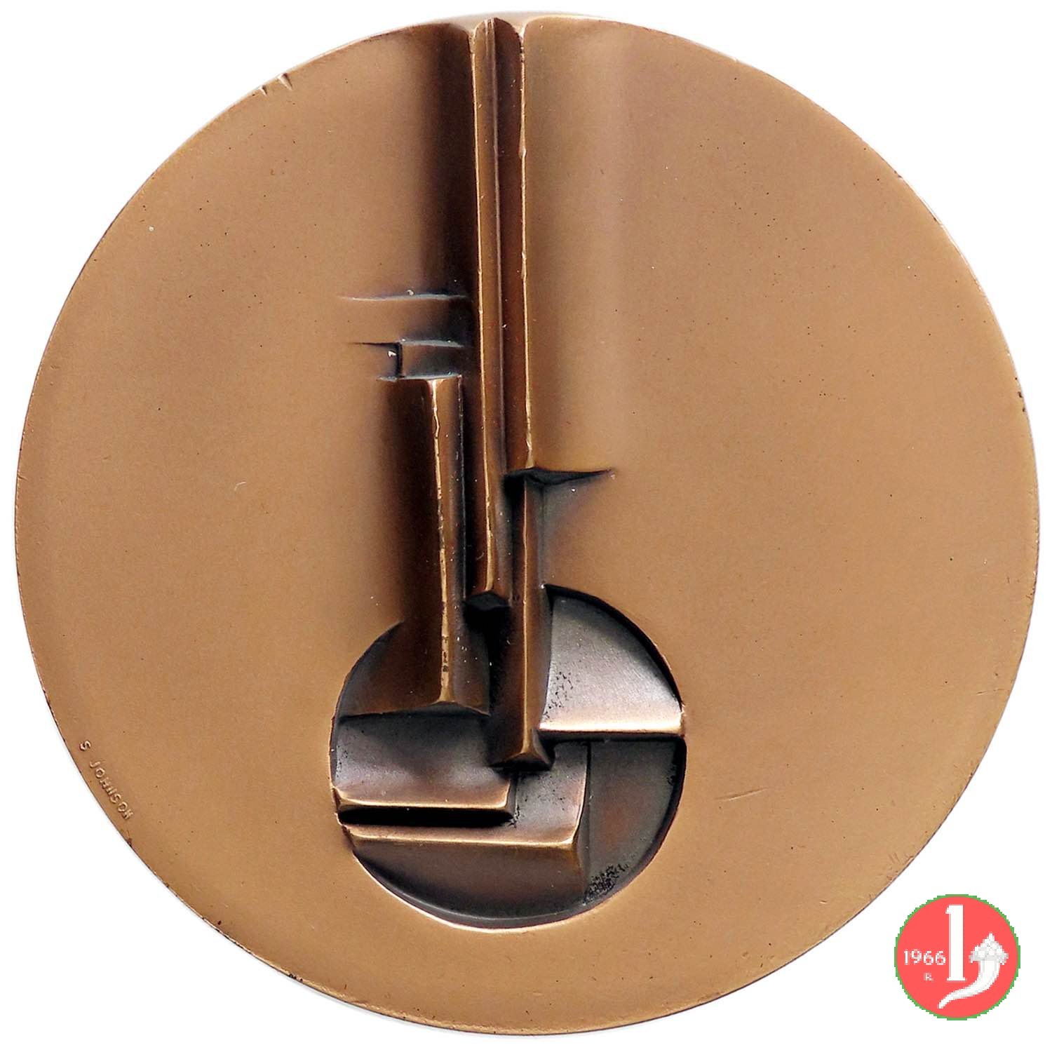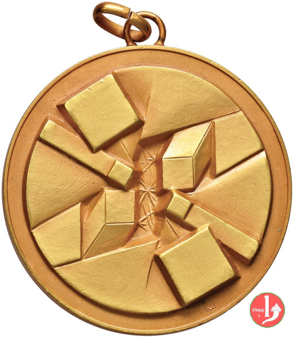 Gio Pomodoro - Medaglia a 3 soli Dritto: tre cubi lisci su puleggia su campo rigato in basso: GIO POMODORO in basso, a dx: S. JOHNSON | |