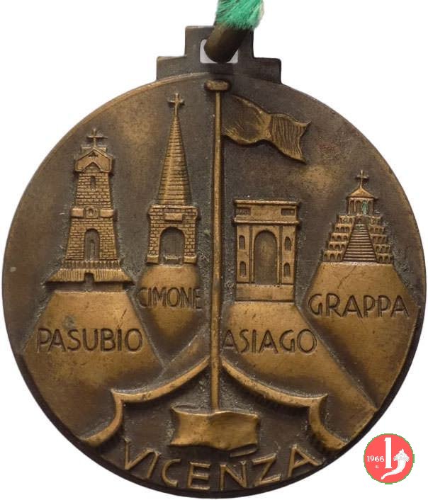 50° Vittoria 1968 Dritto: montagnole con alla sommità la rappresentazione schematica dei Sacrari della grande guerra: PASUBIO _ CIMONE _ ASIAGO _ GRAPPA al centro Bandiera d'Italia radicata su stella con VICENZA entro serto di rami d'alloro e quercia: CINQUANTENARIO = DELLA VITTORIA = 1918 - 1968 | |
