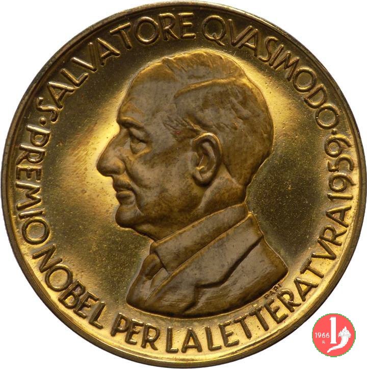 Salvatore Quasimodo 1959 Dritto: SALVATORE QVASIMODO = • PREMIO NOBEL PER LA LETTERATVRA 1959 • busto a sx con giacca, camicia e cravatta sotto: PAPI bireme attraversa le Colonne d'Ercole in basso a dx: VEROI | |
