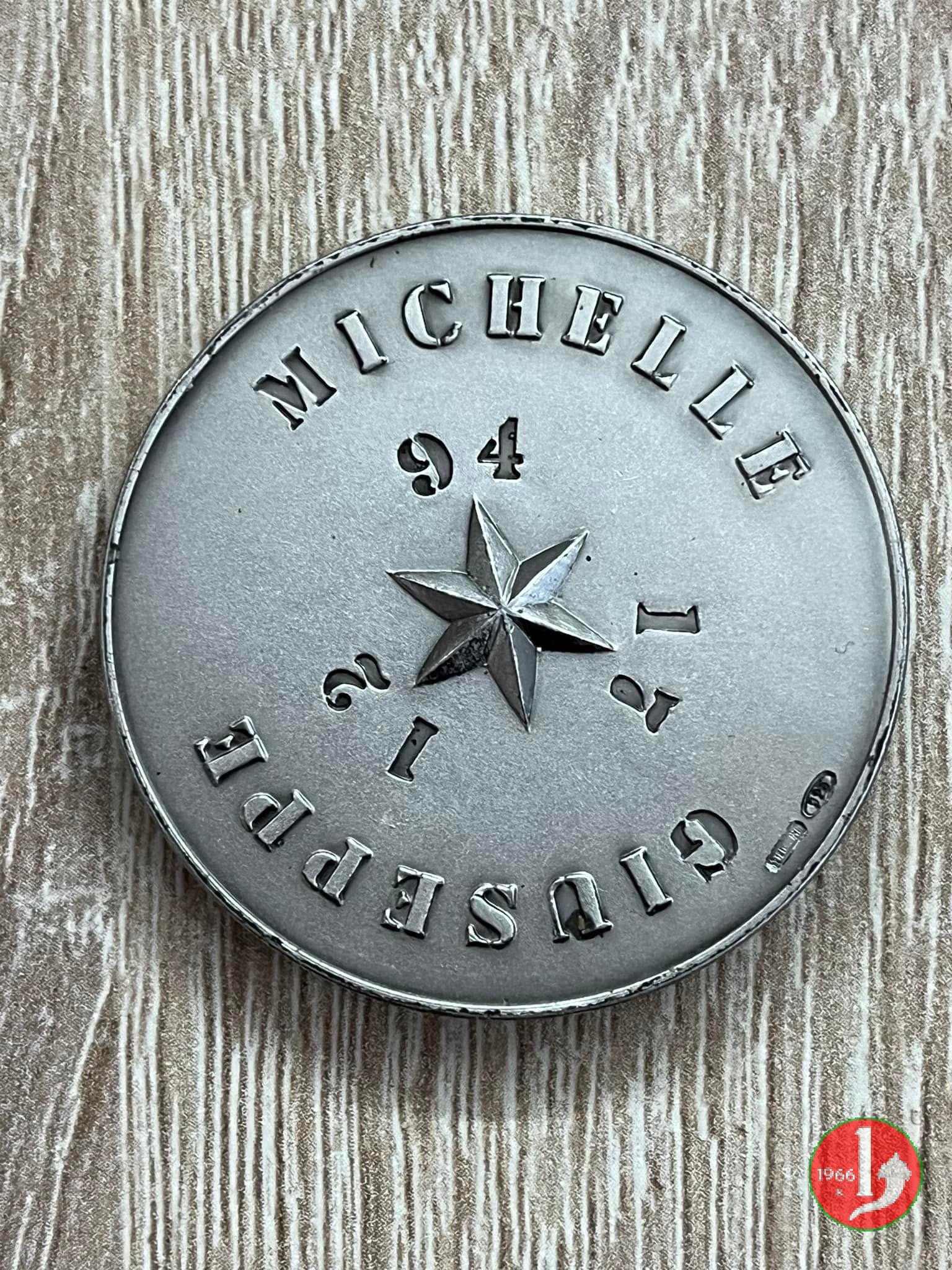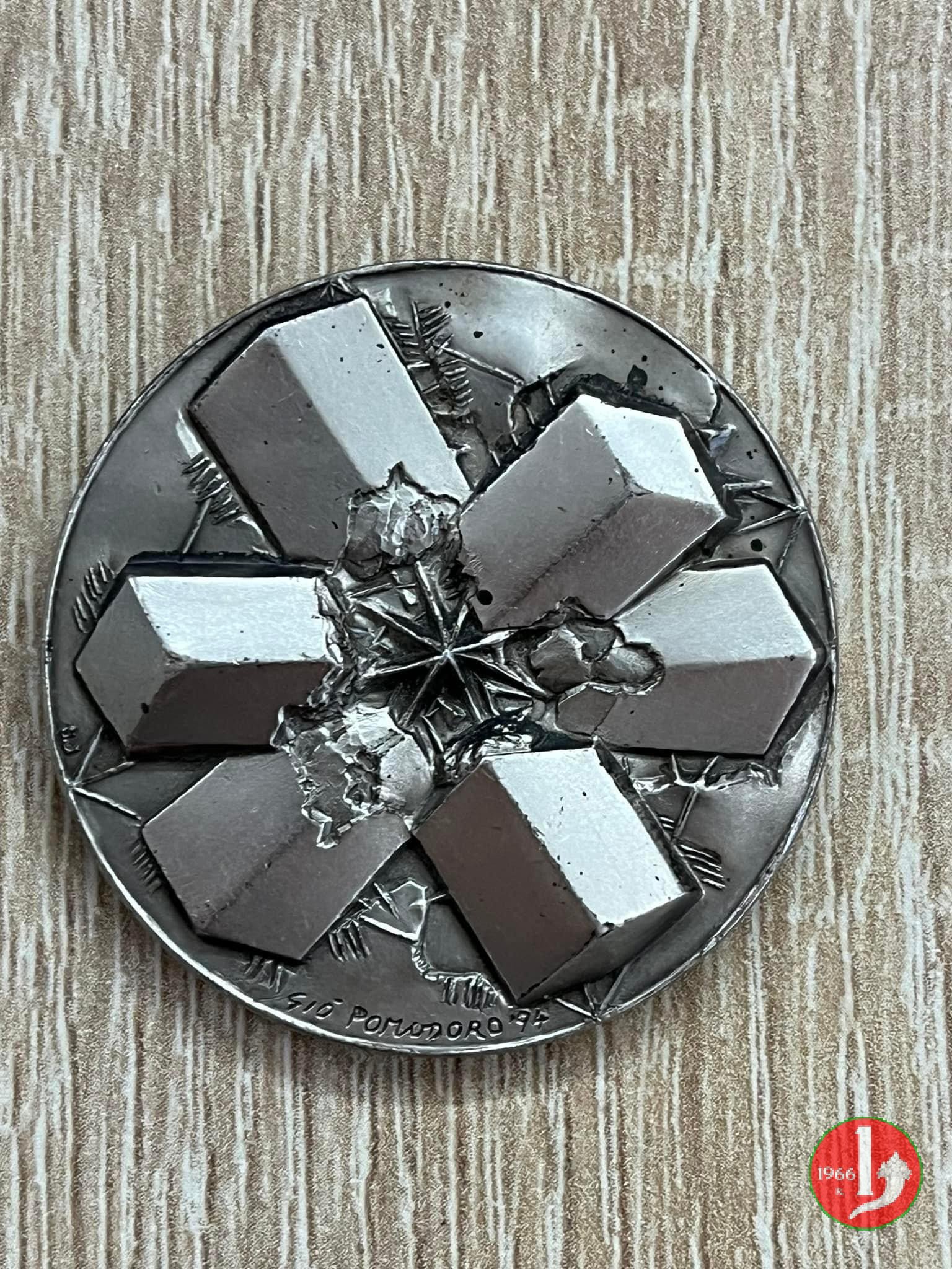 Gio Pomodoro - Giuseppe & Michelle 17-12-1994 Dritto: Stella con attorno sei prismi disposti radialmente in basso, a sx: S.J. in basso, a dx: GIO' POMODORO 94 circolarmente attorno a stella centrale: 17 12 94 | |