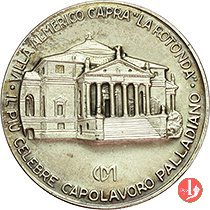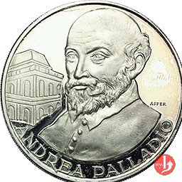 Andrea Palladio-Enc. Numismatica Internazionale Dritto: busto di 3/4 a sx con camicia nel campo, a sx: la Basilica di Vicenza delineata a dx: AFFER sotto, circolarmente: ANDREA PALLADIO Corona turrita su fiocco ferma tre bandiere sulla planimetria dell'Italia | |