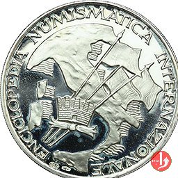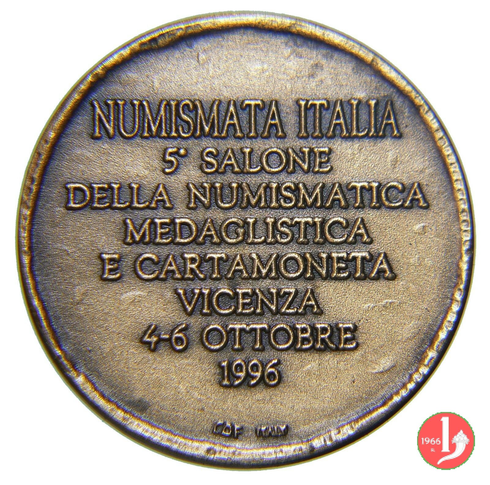 Numismata Italia 1996 Dritto: Riproduzione del dritto dell'Osella di Alvise III Mocenigo Anno VII del 1728: IN VIRTVTE ED ABVNDANTIA PAX figura allegorica della pace in piedi e volta a sx regge ramo d'ulivo e cornucopia tra soldati e veliero in esergo: * 1728 * in basso: CDF ITALY | |