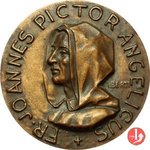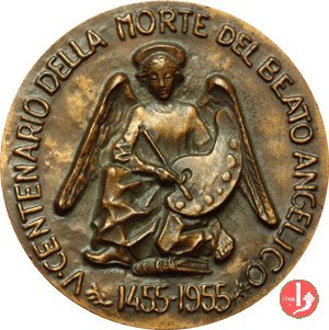 Beato Angelico - V Centenario 1955 Dritto: FR. JOANNES PICTOR ANGELICUS ✠ busto a sx con cappuccio nel campo, a dx: A. BERTI Angelo nimbato regge tavolozza e pennello di fronte, in basso libro sotto: 1455-1955 | |