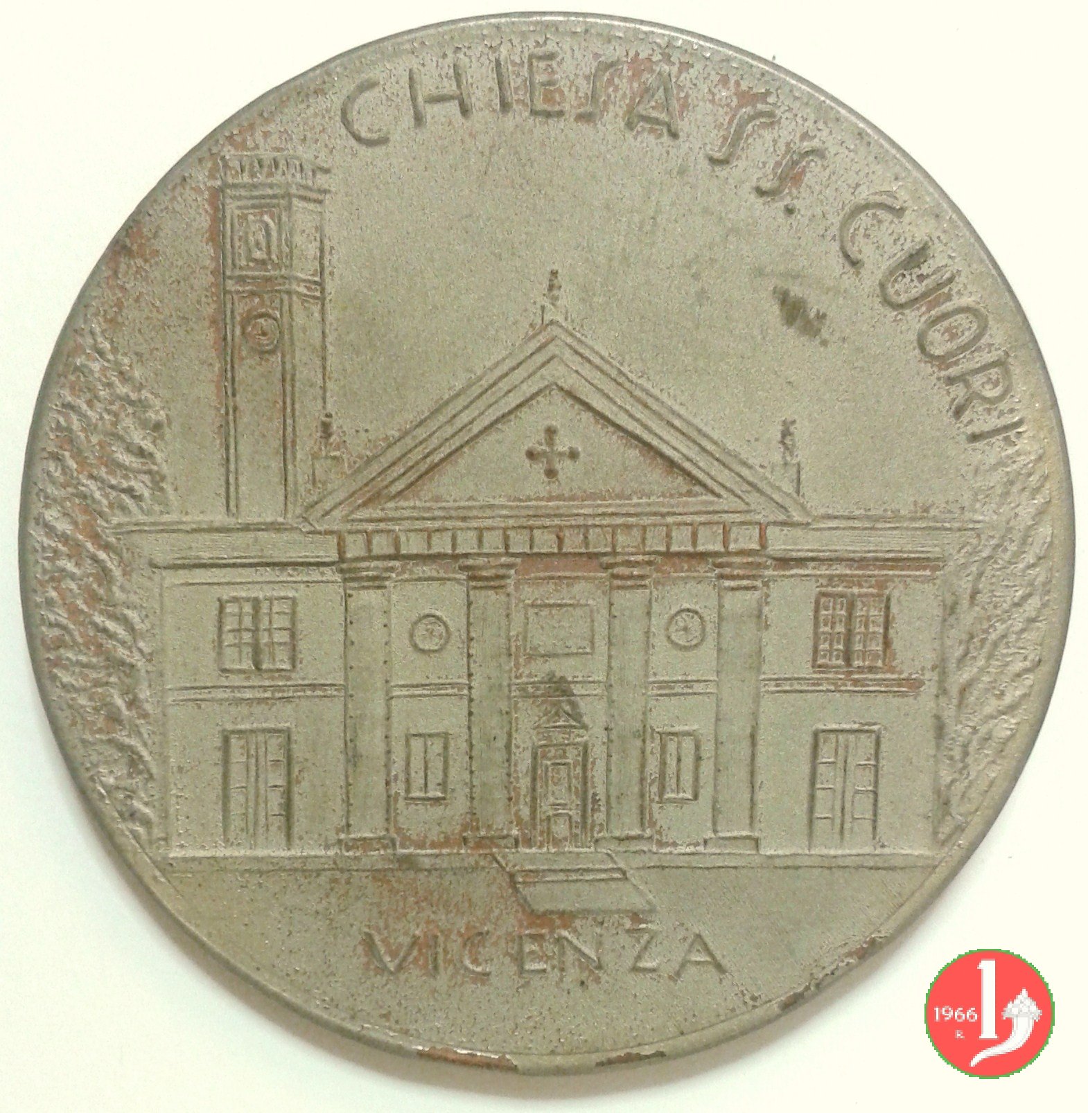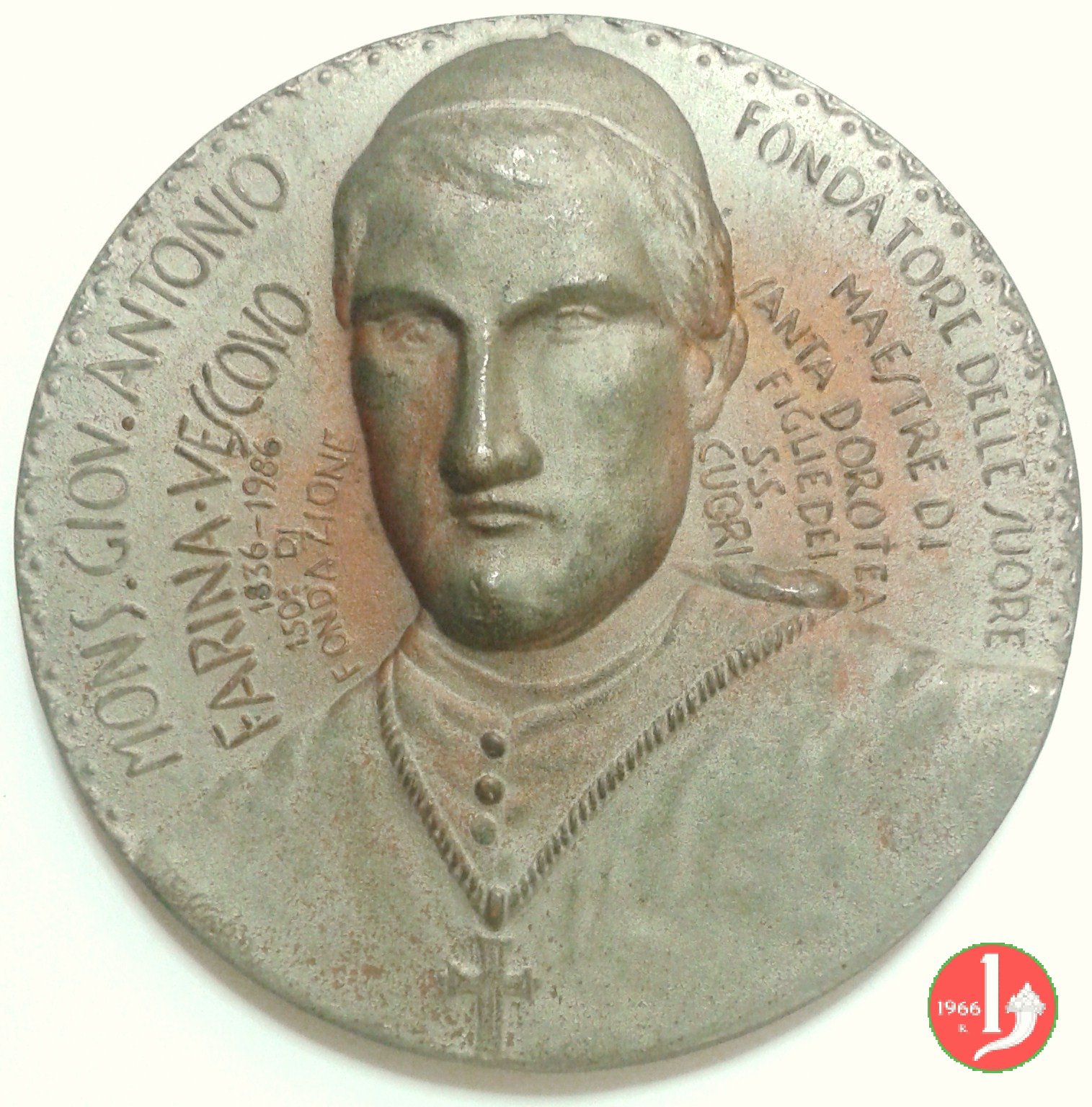 Giovanni Antonio Farina - 150° Chiesa SS. Cuori 1986 Dritto: a sx, circolarmente: MONS. GIOV. ANTONIO = FARINA • VESCOVO = 1836-1986 = 150° DI = FONDAZIONE a dx, circolarmente: FONDATORE DELLE SUORE = MAESTRE DI = SANTA DOROTEA = FIGLIE DEI = S.S. CUORI busto di fronte con berretto, mozzetta e Croce pettorale Vista anteriore della Chiesa in esergo: VICENZA | |