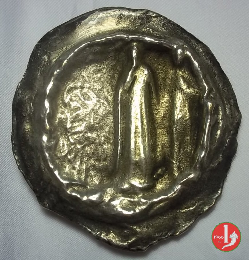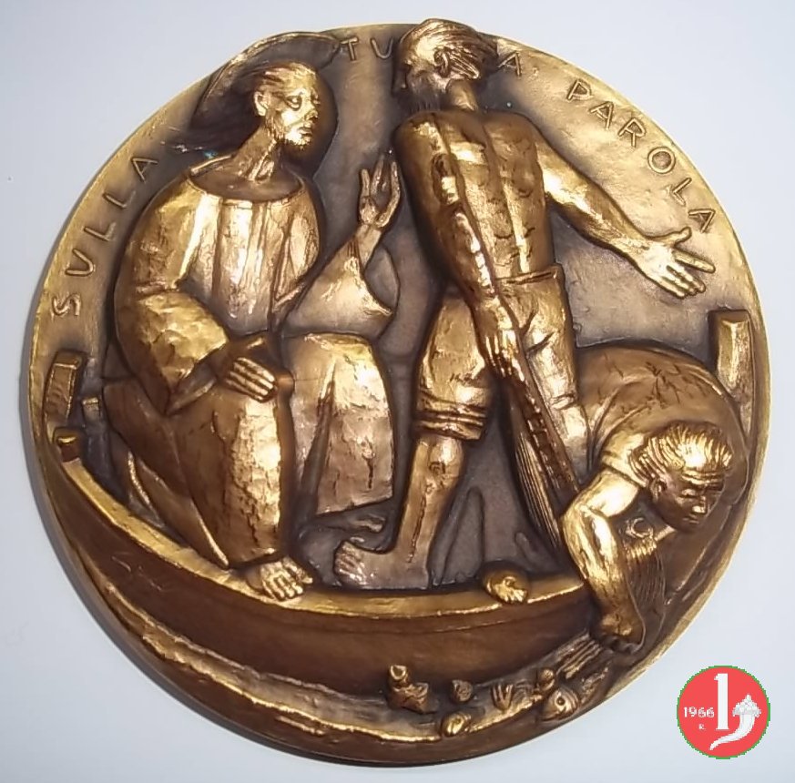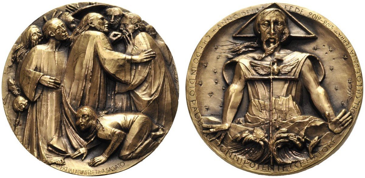 Angelo Grilli - Anno della Fede 2012-2013 Dritto: Scena dal Vangelo di Marco, Gesú guarisce la figlia di una Cananea: Gesú in piedi, nimbato e volto a dx, tra la folla, ai suoi piedi la guarita genuflessa verso sx in basso, circolarmente: FIGLIA LA TUA FEDE TI HA SALVATO a dx, presso il bordo: GRILLI Dio Padre con il triangolo e la colomba dello Spirito Santo in petto divide le acque a dx: GRILLI | |