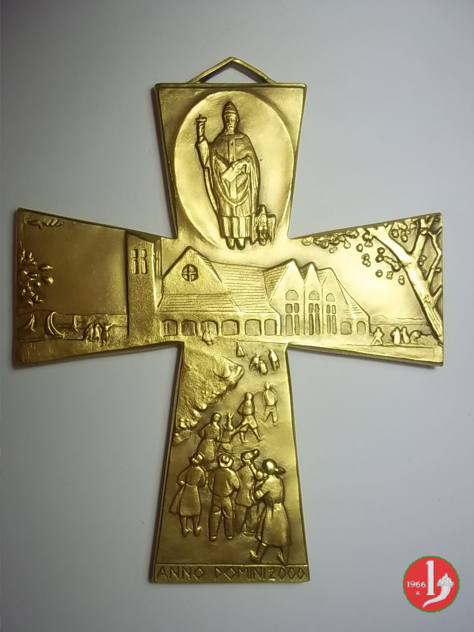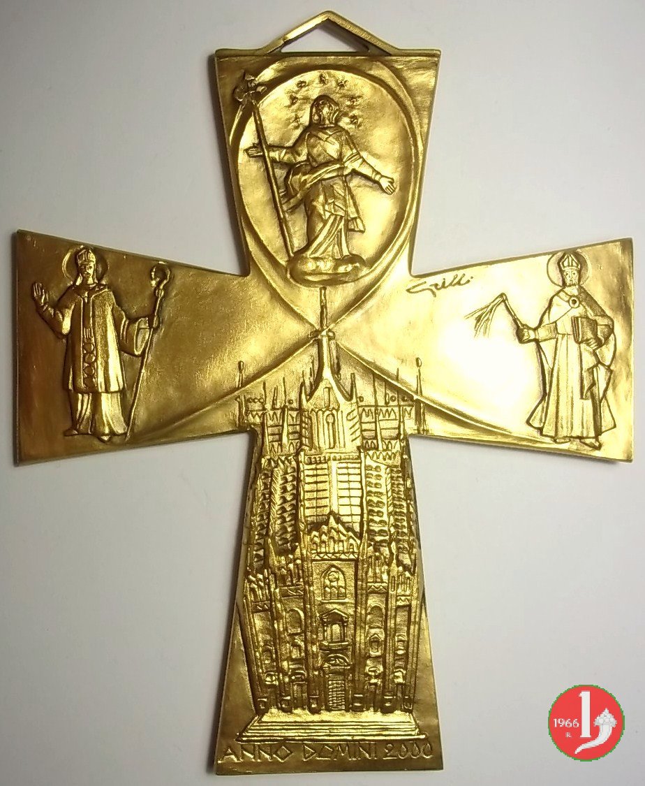 Angelo Grilli - Croce del Giubileo per Milano 2000 Dritto: La trinità su Cristo nimbato in Croce sul braccio di dx: GRILLI sotto a dx: SJ in basso: ANNO DOMINI 2000 sui bracci laterali: San Carlo Borromeo benedicente con mitra pianeta e pastorale e San'Ambrogio con mitra e piviale regge frusta o flagello e libro sul braccio di dx: GRILLI in basso: ANNO DOMINI 2000 | |