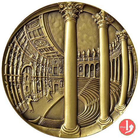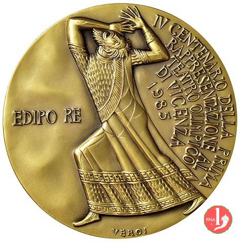 400° Edipo Re - Teatro Olimpico 1985 Dritto: circolarmente, nel campo, a sx: IV CENTENARIO DELLA PRIMA = RAPPRESENTAZIONE AL = TEATRO OLIMPICO = DI VICENZA = 1985 figura teatrale di Edipo Re, in piedi, a sx nel campo, a dx: EDIPO RE in basso: VEROI in basso: S. JOHNSON | |
