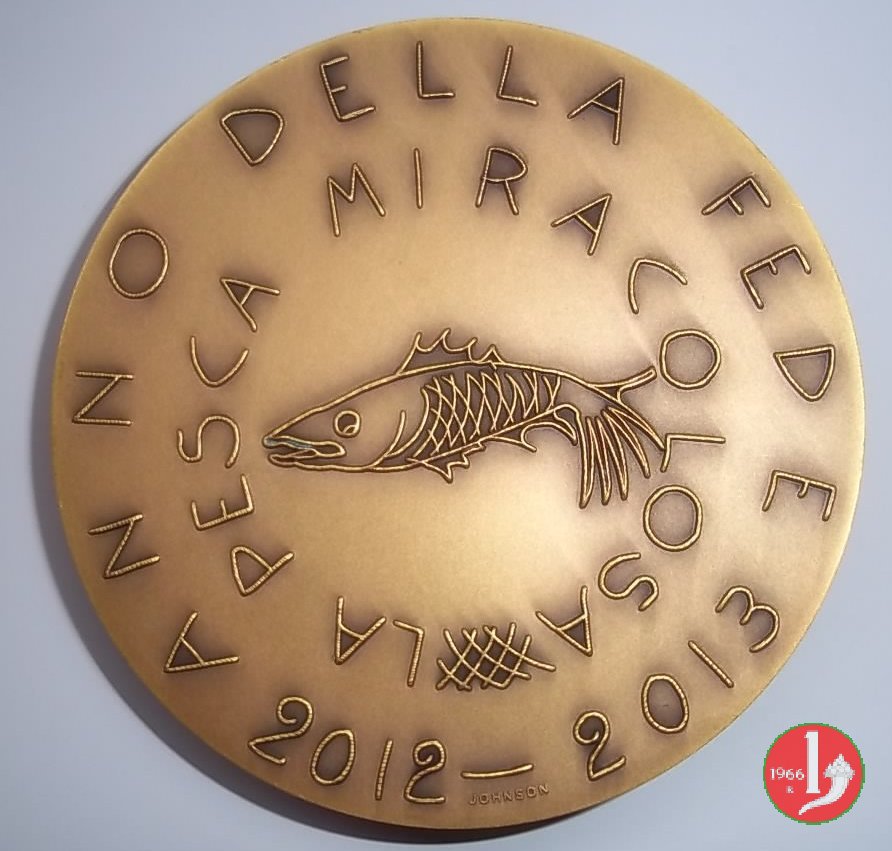 Angelo Grilli - Anno della Fede 2012-2013 Dritto: SVLLA _ TV _ A _ PAROLA Gesú Cristo nimbato e seduto in barca, rivolto a dx, con due Apostoli che tirano le reti (evoca il passo del Vangelo di Luca con la pesca miracolosa) in basso a sx, sulla barca: GRILLI nel contorno interno: LA PESCA MIRACOLOSA # Pesce a sx | |