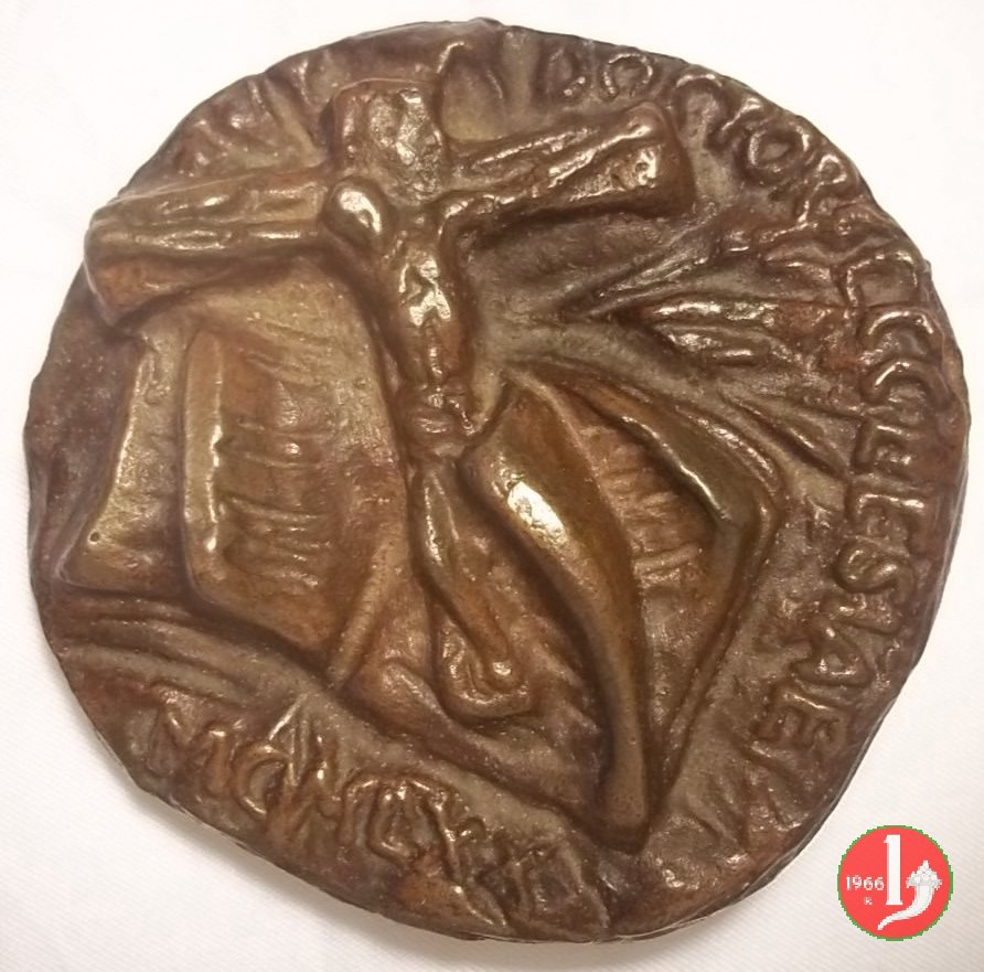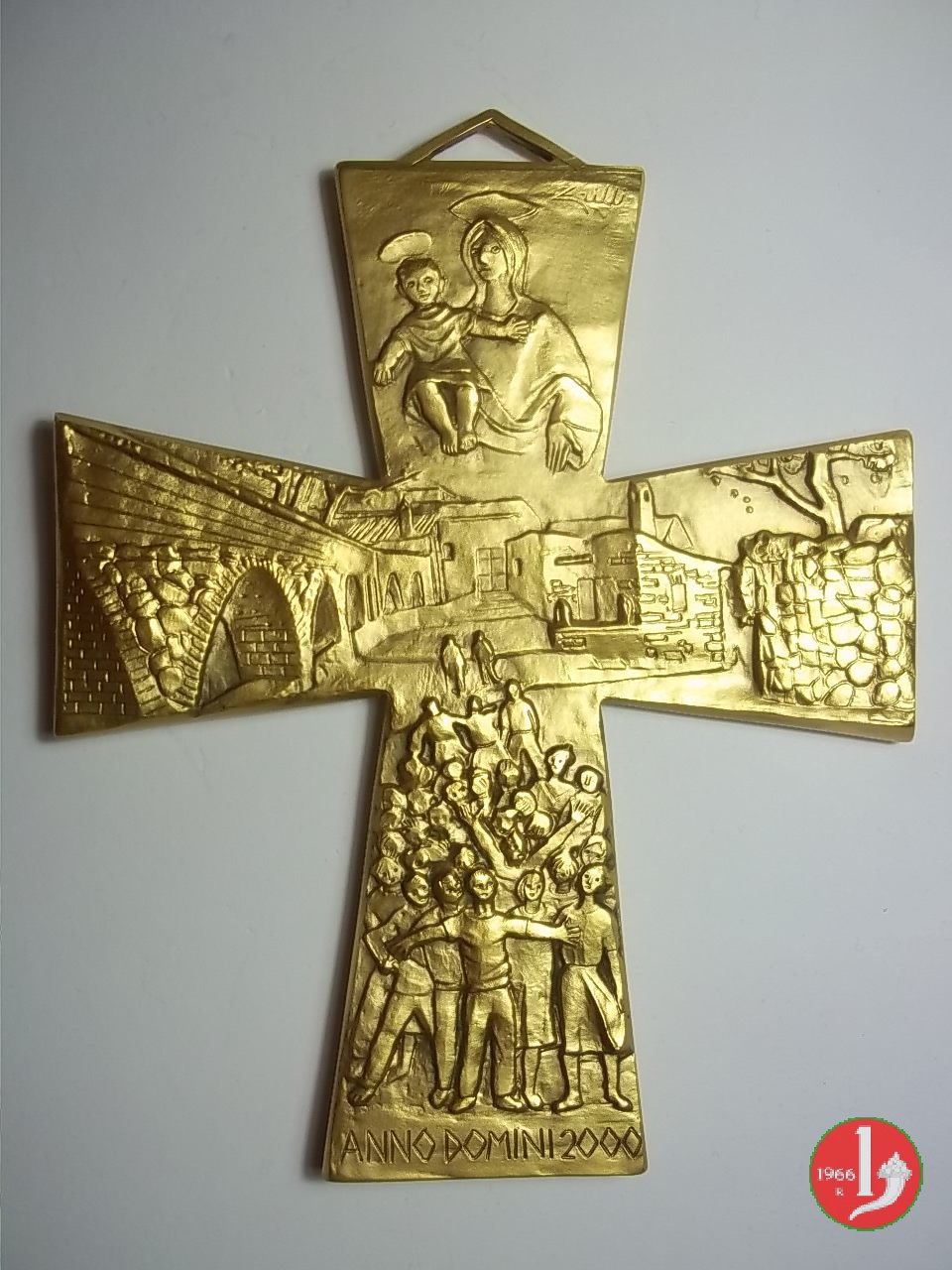 Angelo Grilli - Croce del Giubileo per Comunità Incontro di don Gelmini Amelio Dritto: Gesú Cristo in Croce e nimbato sormontato dalla Colomba dello Spirito Santo e da Dio Padre benedicente su nimbo a triangolo sul braccio a dx: GRILLI in basso: ANNO DOMINI 2000 al centro: Vista del complesso sotto: folla di fedeli in basso: ANNO DOMINI 2000 | |