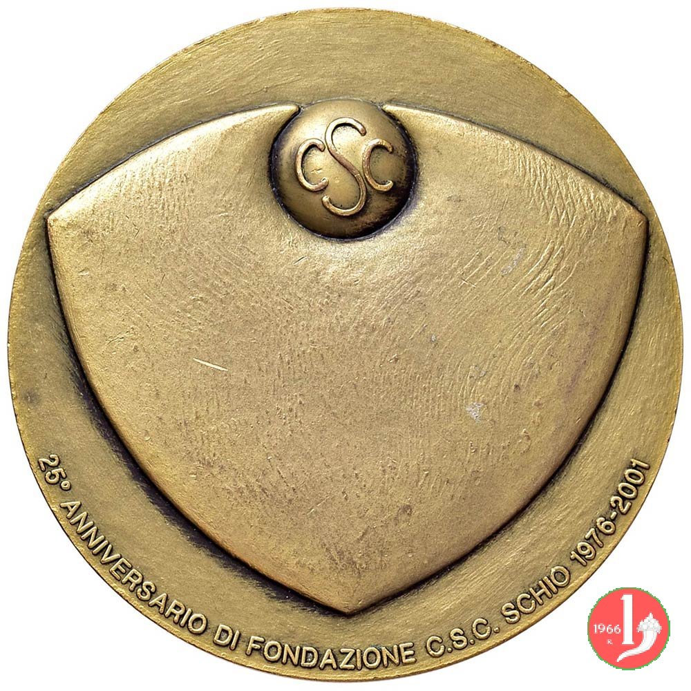 Schio - 25° Fondazione C.S.C. 2001 Dritto: Logo del CSC composto da forma triangolare con lati curvilinei e triangolo zigrinato in basso: DAL BIANCO in basso, circolarmente: 25° ANNIVERSARIO DI FONDAZIONE C.S.C. SCHIO 1976-2001 | |