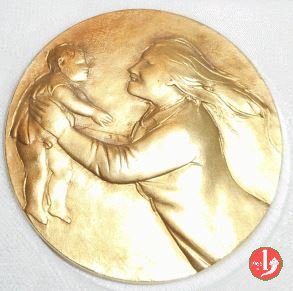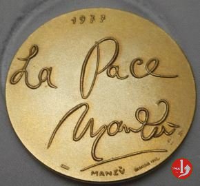 Giacomo Manzú - La Pace 1977 Dritto: busto di figura femminile con lunghi capelli e volta a sx, regge bambino seminudo Verso: 1977 nel campo: LA PACE = MANZU' in basso, presso il bordo: LANDI _ MANZU' _ PAPALUCA INC. | |