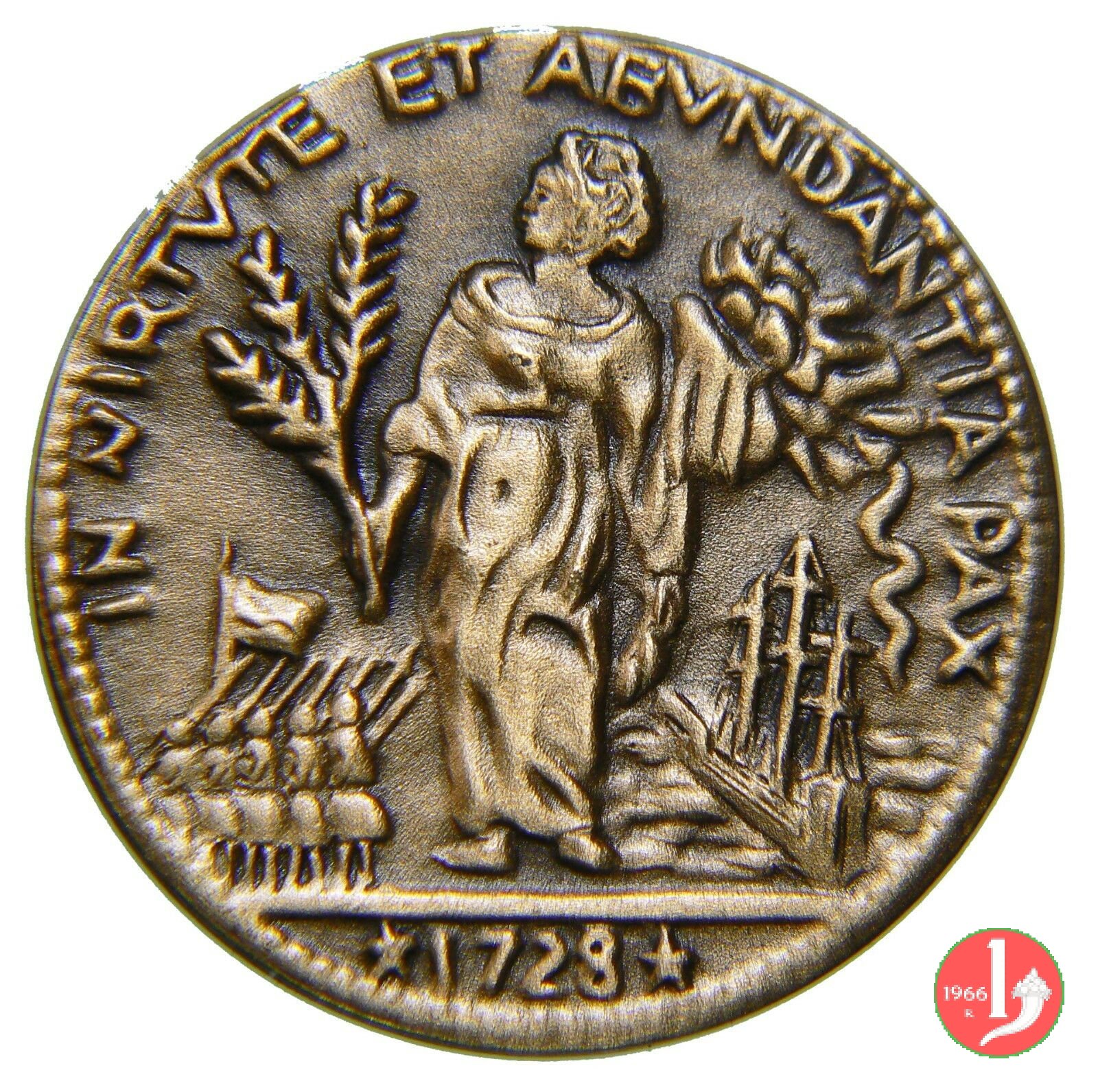 1° Numismata 1992 Dritto: riproduzione del Verso dell'Osella di Alvise III Mocenigo Anno VII del 1728: IN VIRTVTE ET ABVNDANTIA PAX La figura allegotica dell'Abbondanza, in piedi, di fronte, regge cornucopia ricolma di frutti e ramo d'ulivo in basso: milizie veneziane ed una nave da guerra in esergo: * 1728 * | |