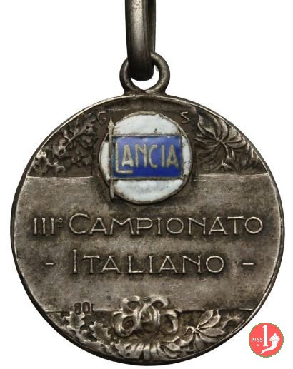3° Campionato Italiano di Atletica Leggera - Lancia Dritto: Atleta in piedi regge statuetta della Vittoria alata e bandiera, sullo sfondo atleti impegneti varie specialità dell'atletica entro stadio Verso: su rami di quercia e d'alloro in alto logo LANCIA entro medaglia a smalti blu e bianchi al centro entro nastro: III° CAMPIONATO = - ITALIANO - | |