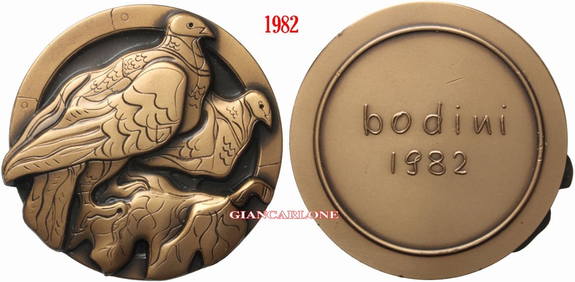 Floriano Bodini - Le Colombe 1982 Dritto: due colombe su ramo volte a dx Verso: nel campo entro cerchio continuo: BODINI = 1982 | |