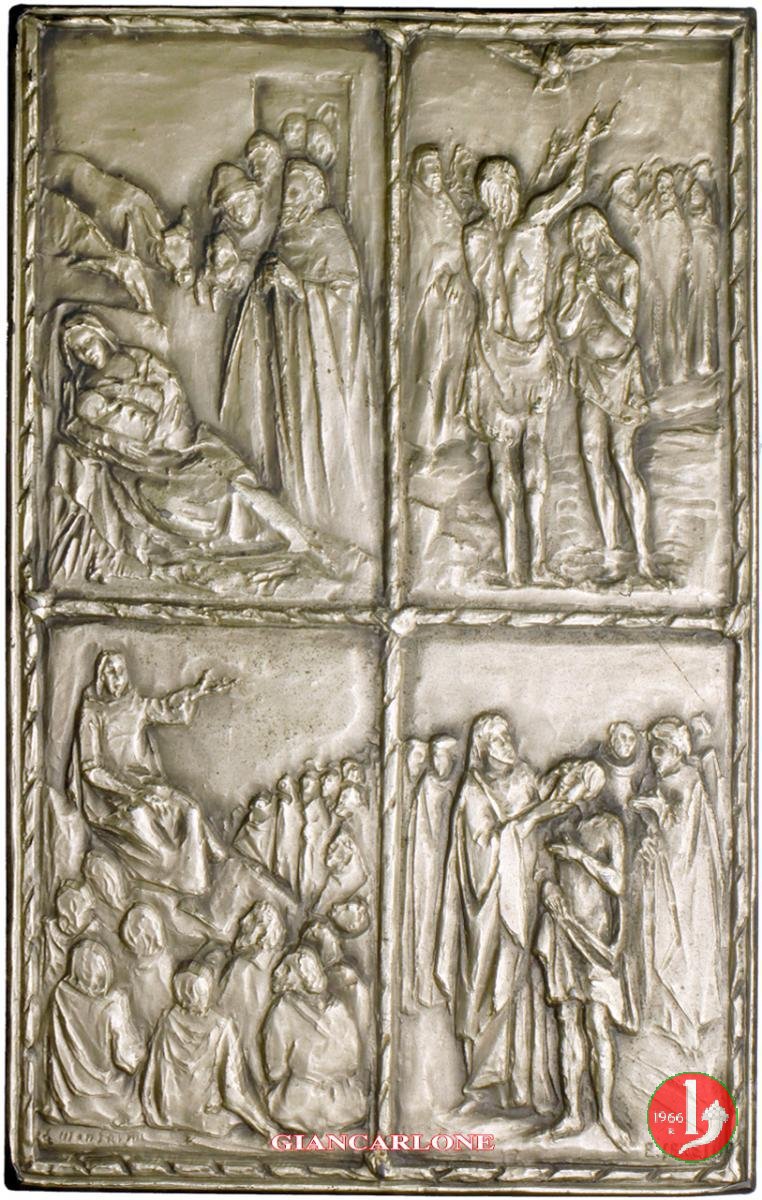 Enrico Manfrini - Vita di Gesú Dritto: entro quattro riquadri divisi a Croce da festoncino: Natività con adorazione dei magi e dei pastori, San Giovanni Battista intento nel Battesimo di Gesú Cristo, Predica tra le folle, guarigione del cieco nato in basso a sx: E. MANFRINI in basso a dx: E. SENESI | |