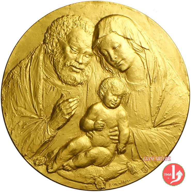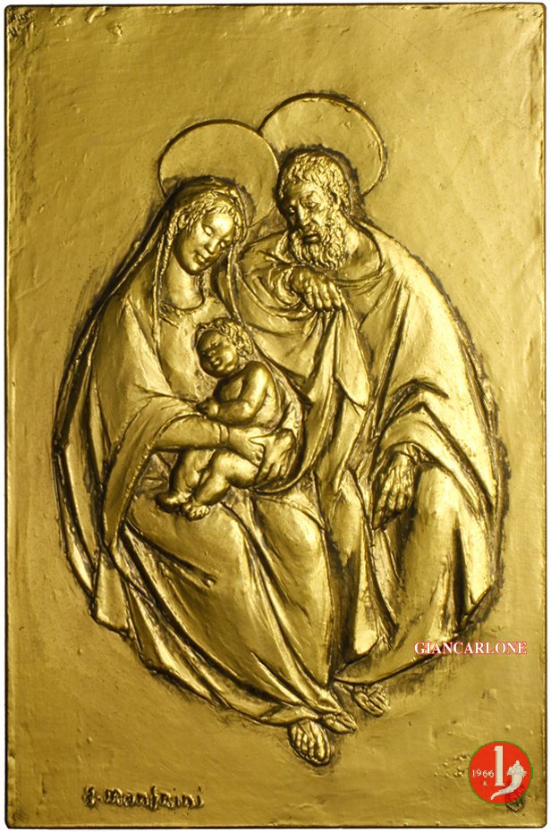 Enrico Manfrini - Natività Dritto: San Giuseppe e la B. V. maria seduti e nimbati con mantelli e il Bambino Gesú deposto sulle gambe materne in basso: E. MANFRINI _ logo Senesi ES = M | |
