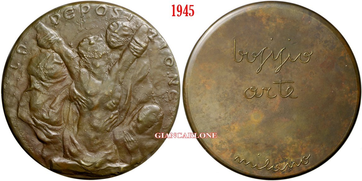 Ettore Calvelli - Deposizione 1945 Dritto: LA _ DEPOSI _ ZIONE torso di Cristo deposto dalla Croce e sorretto da tre figure in basso a sx: 1945 CALVELLI in basso: MILANO | |