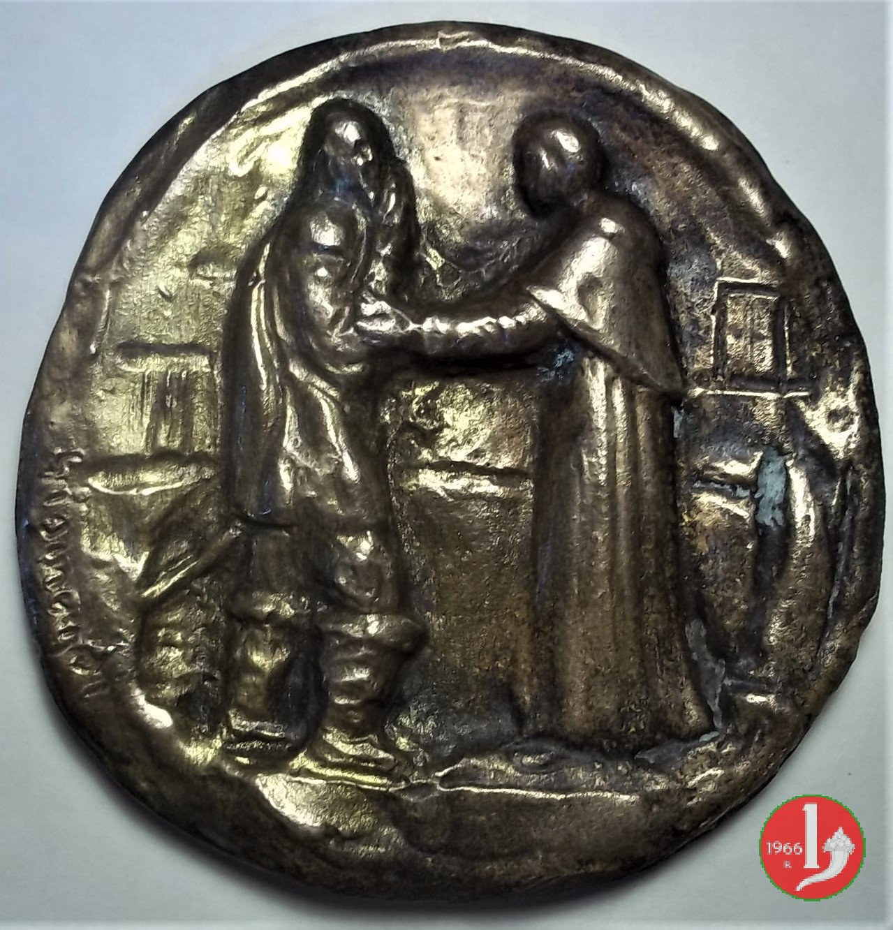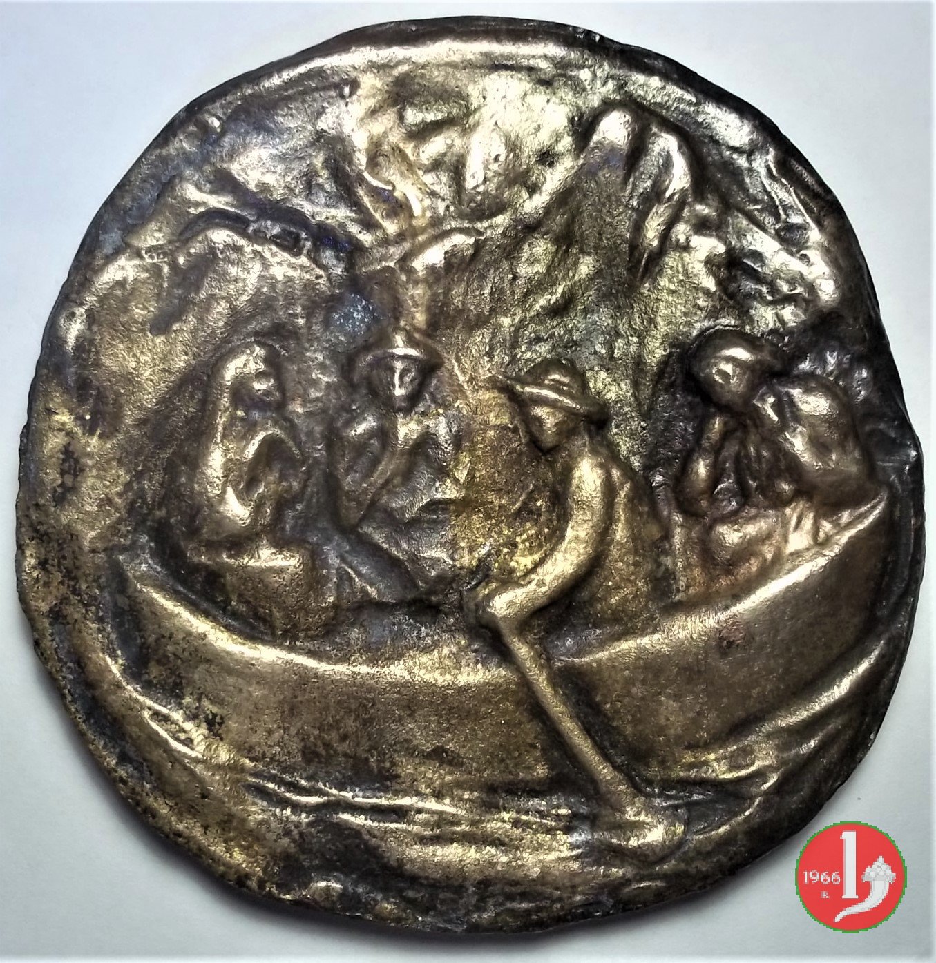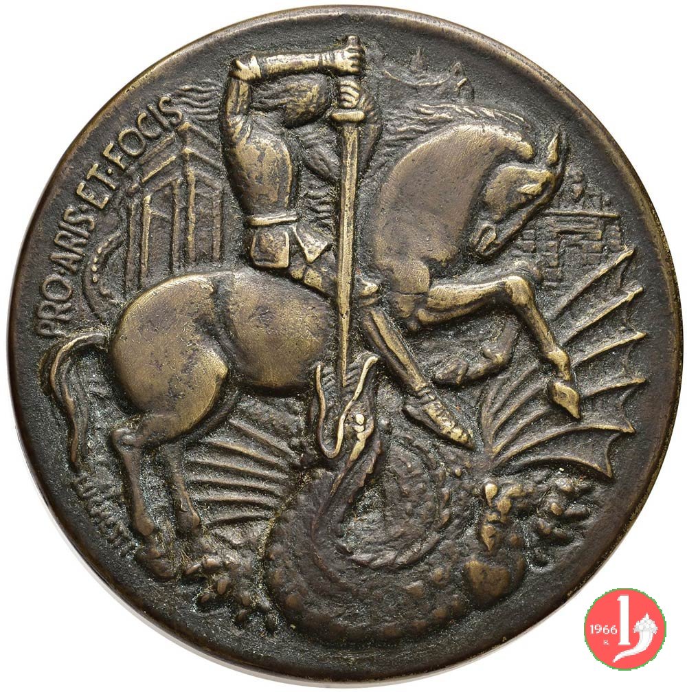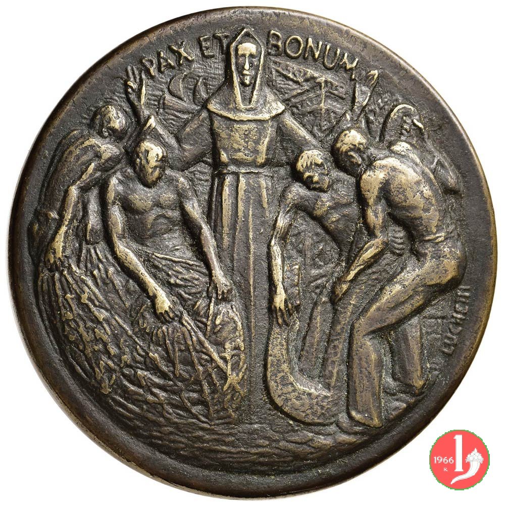 Americo Sesto Luchetti - Pro Aris et Focis Dritto: PAX ET _ BONUM Frate benedicente tra quattro pescatori che tirano le reti in basso, a Dx: LUCHETTI San Giorgio a cavallo verso dx trafigge drago con spada, sullo sfondo l'Arco di Traiano ad Ancona in basso, a sx: LUCHETTI | |
