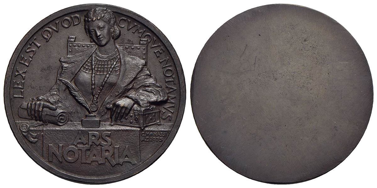 Guerrino Mattia Monassi - Ars Notaria 1975 Dritto: LEX EST QVOD _ CVMQVE NOTAMVS busto di figura allegorica femminile dell'Arte Notaria seduta a scrivania con calamaio, regge cartiglio sigillato e scrigno in esergo, su tela: ARS = NOTARIA a dx: G. MONASSI = A.D. 1975 | |