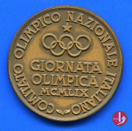 C.O.N.I. - Giornata Olimpica 1959 Dritto: La figura allegorica della Vittoria alata drappeggiata suona la tromba e regge ramo d'alloro volta verso dx presso tripode ardente in esergo: P MORBIDVCCI • nel campo sotto a stella raggiante su cerchi olimpici: GIORNATA = OLIMPICA = MCMLIX | |