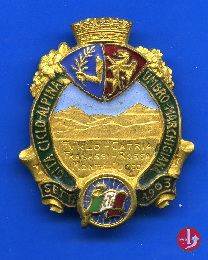 Gita Ciclo Alpina Umbro Marchigiana 1903 Dritto: In alto due stemmi turriti su nastro verde fermato in basso dal logo del TCI: GITA CICLO-ALPINA _ UMBRO-MARCHIGIANA = SETT. _ 1903 Paesaggio collinare in esergo: FVRLO-CATRIA = FRASASSI - ROSSA = MONTE CUCCO | |