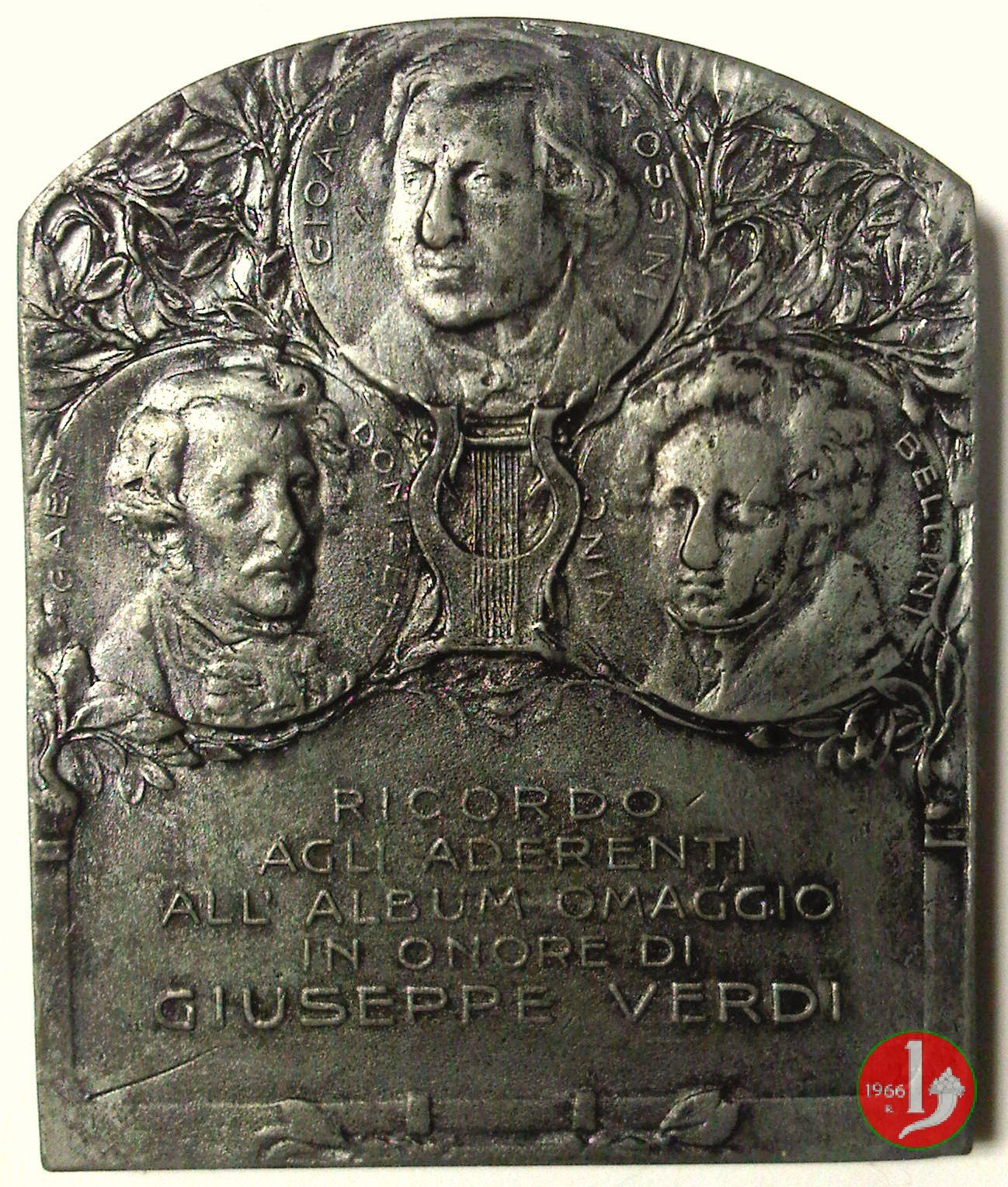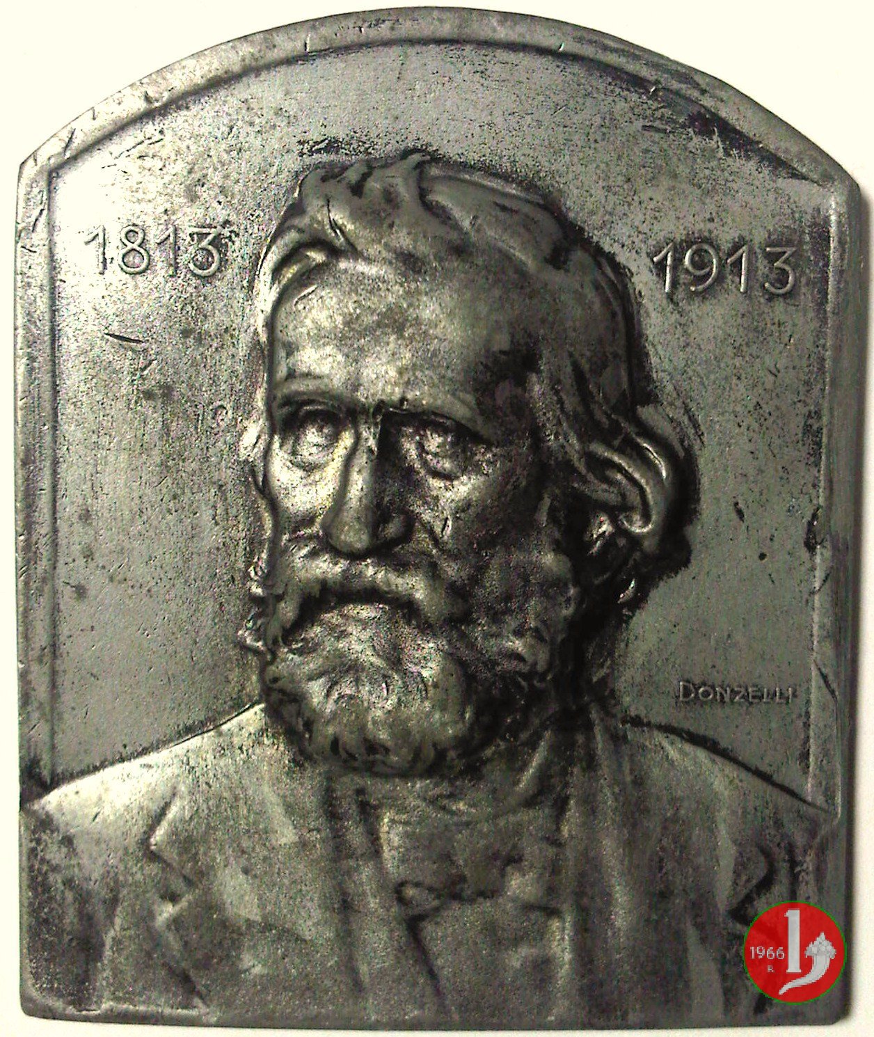Placchetta Omaggio Giuseppe Verdi 1913 Dritto: busto di 3/4 a sx di Giuseppe Verdi con giacca, camicia e papillon ai lati, in alto: 1813 _ 1913 nel campo, a dx: DONZELLI al centro: lira sotto, entro cornice: RICORDO = AGLI ADERENTI = ALL'ALBUM OMAGGIO = IN ONORE DI = GIUSEPPE VERDI | |