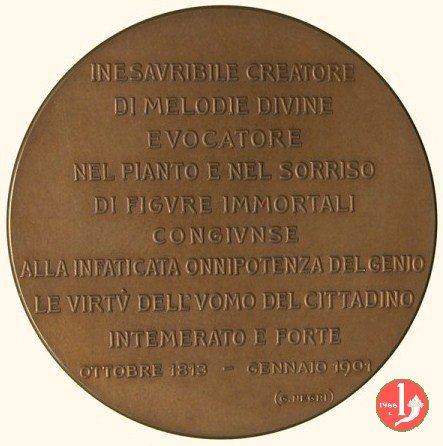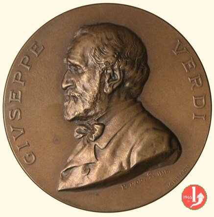 Giuseppe Verdi 1901 Dritto: busto nudo a sx di Giuseppe Verdi entro ghirlanda d'alloro, sorretta da due giovani, posta su ara ornata da lira a sx della lira: EB sulla base a dx: S. JOHNSON in esergo entro targa: • MDCCCXIII-MCMI • | |