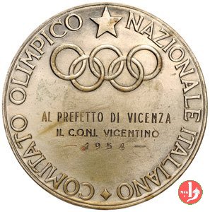 C.O.N.I. 1954 Dritto: Figura allegorica della vittoria ad ali spiegate, solleva la mano di atleta nudo; sullo sfondo stadio in basso, a sx: P. MORBI- = DVCCI • i cinque cerchi Olimpici e sotto dedica (1954) | |