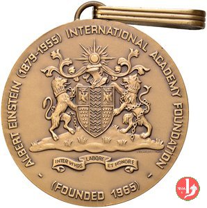 USA - Albert Einstein International Academy 1965 Dritto: ALBERT • EINSTEIN testa a sx in basso: ROMON= = DINI V. Stemma sormontato da cimiero e sorretto da due leoni incatenati su prato sotto, entro nastro: INTER VIVOS _ LABORE _ ET HONORE | |