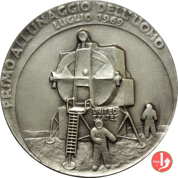 Primo Allunaggio dell'Uomo 1969 Dritto: PER SEGUIR VIR _ TUDE _ E CONOSCENZA Sedalo, in piedi e volto a sx, sistema le ali a Icaro nudo, in piedi, di fronte con le braccia alzate in basso, a sx: MONASSI in basso a dx: S. JOHNSON in alto, circolarmente: LUGLIO 1969 entro medaglia decentrata verso il basso: la camminata spaziale di Neil Armstrong e Buzz Aldrin attorno all'Apollo 11 | |
