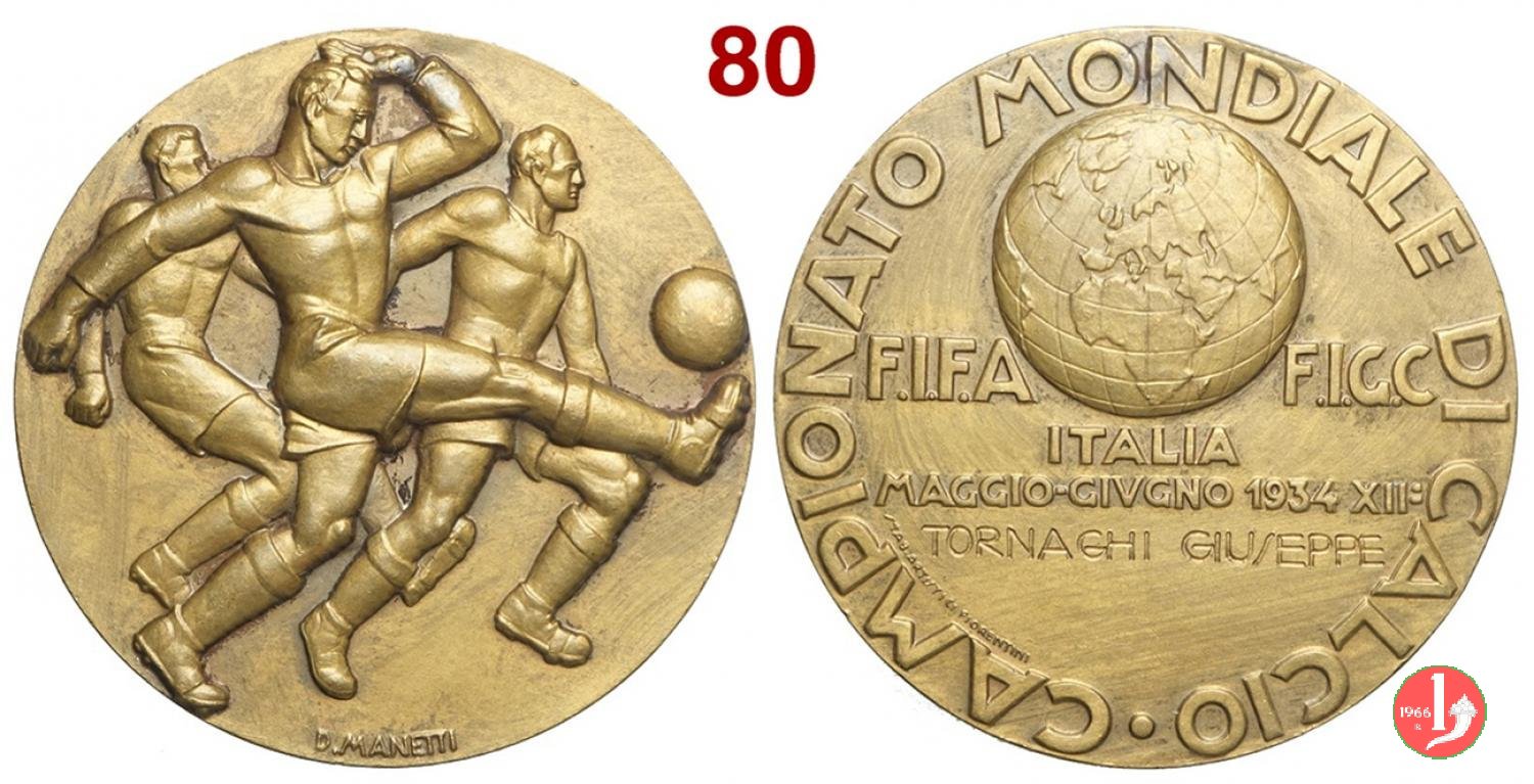 Coppa del Mondo di Calcio 1934 Dritto: in alto, entro setto circolare, tra fasci: COPPA DEL MONDO = FOOTBALL = ITALIA = 1934 XII Globo terrestre in smalti gialli e celesti tra due calciatori impegnati in palleggi in basso: dedica | |