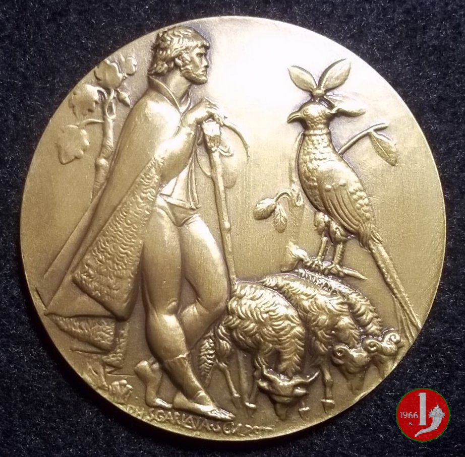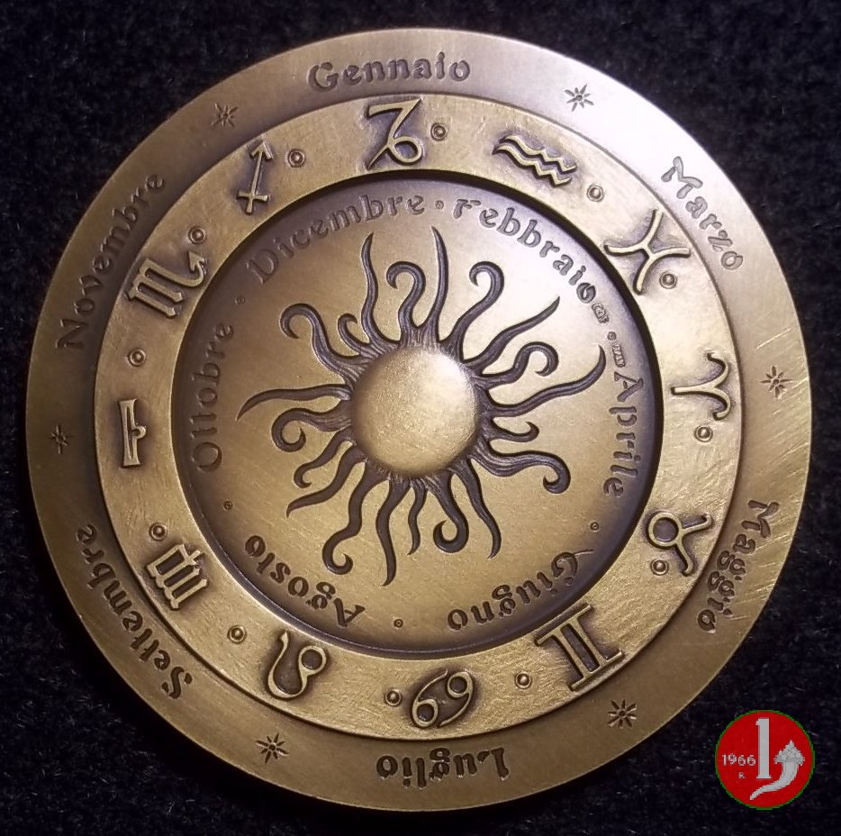 Filippo Sgarlata - Segni Zodiacali Dritto: Pastore in piedi e volto a dx, con cappa e bastone, presso tre pecore al pascolo e pavone in esergo: PH • SCGARLATA SCULPSIT nel cerchio interno su fascia rilevata: i simboli dei dodici segni zodiacali nel secondo cerchio interno: FEBBRAIO • APRILE • GIUGNO • AGOSTO • OTTOBRE • DICEMBRE • al centro: sole raggiante a dx: CDF ITALY | |