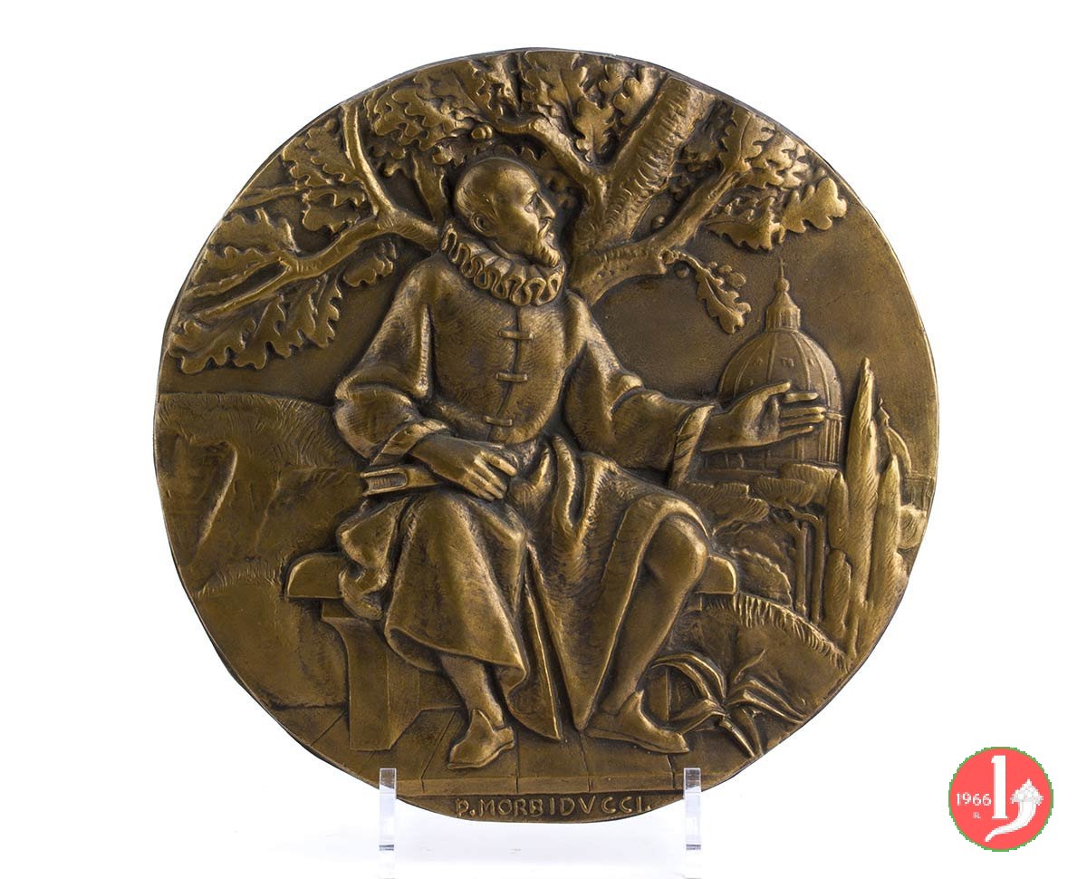 Publio Morbiducci - Galileo Galilei 250mm Dritto: Galileo seduto e volto a dx presso albero di quercia, mira la cupola della Basilica di San Pietro in esergo: P. MORBIDVCCI. | |