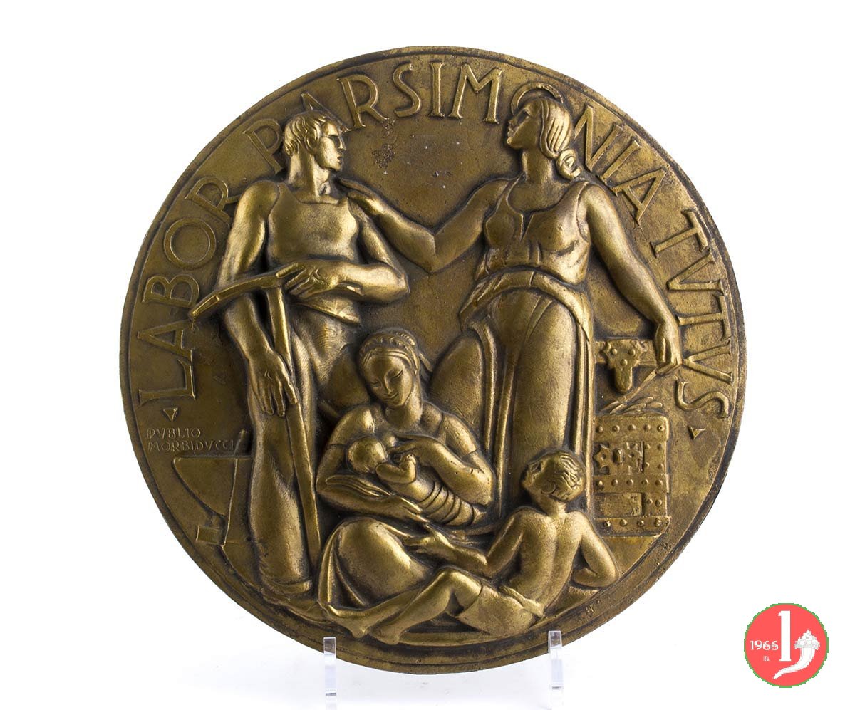 Publio Morbiducci - Il Lavoro e il Risparmio Dritto: _ • LABOR PARSIMONIA TVTVS • Operaio in piedi e volto a dx regge picco presso incudine e la figura femminile allegorica del risparmio presso forziere; in basso mamma con due bambini nel campo a sx: PVBLIO = MORBIDVCCI | |