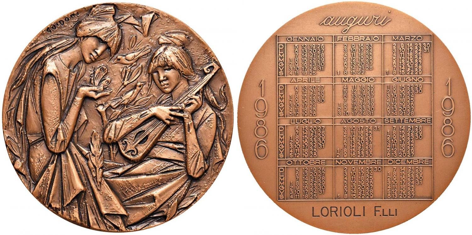 Ferruccio Guidotti - Calendario 1986 Dritto: Due figure femminili con luito e farfalla tra fiori e uccelli in alto: GUIDOTTI il Calendario 1986 ai lati: 1986 in basso: LORIOLI F.LLI | |