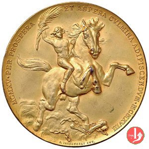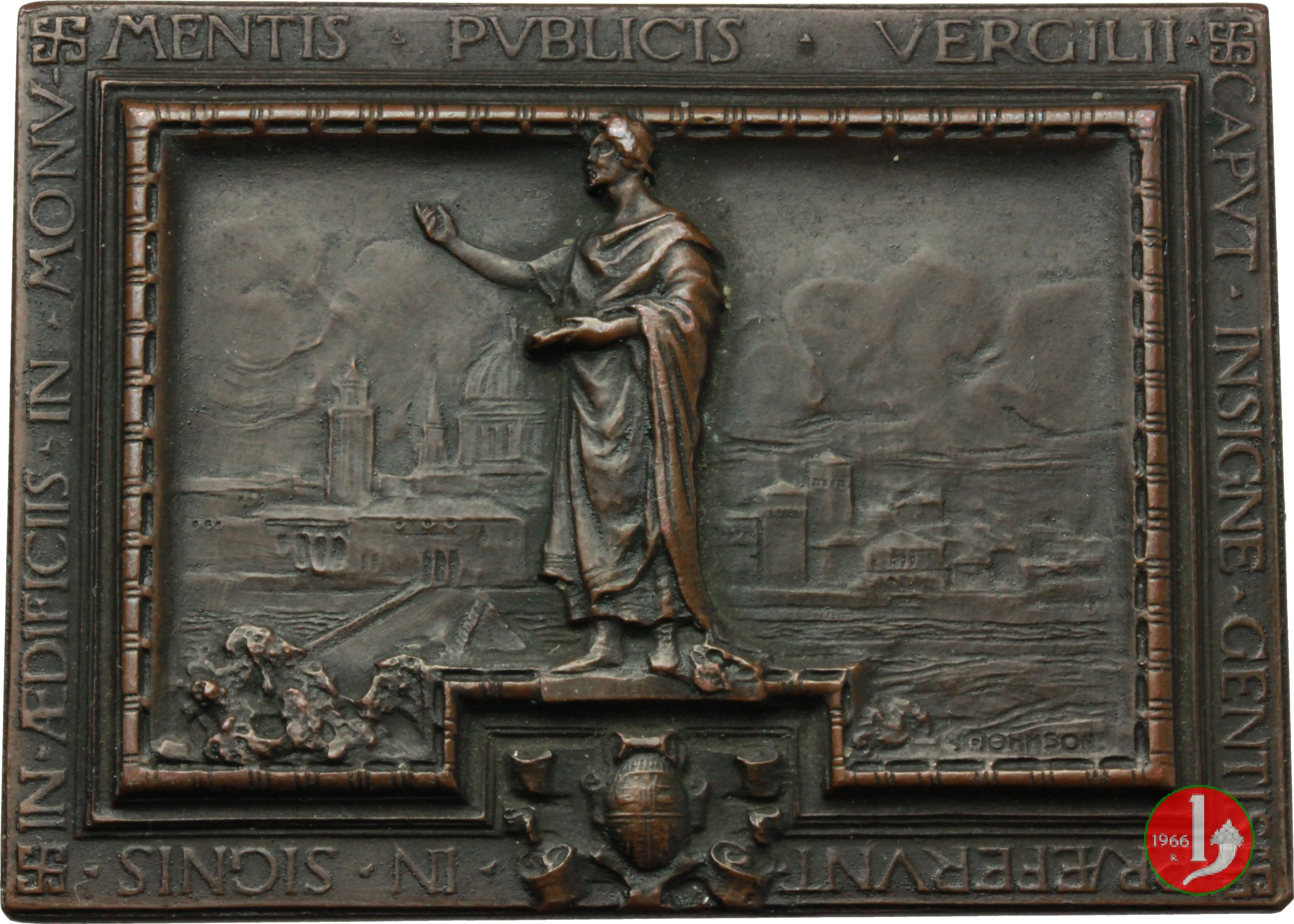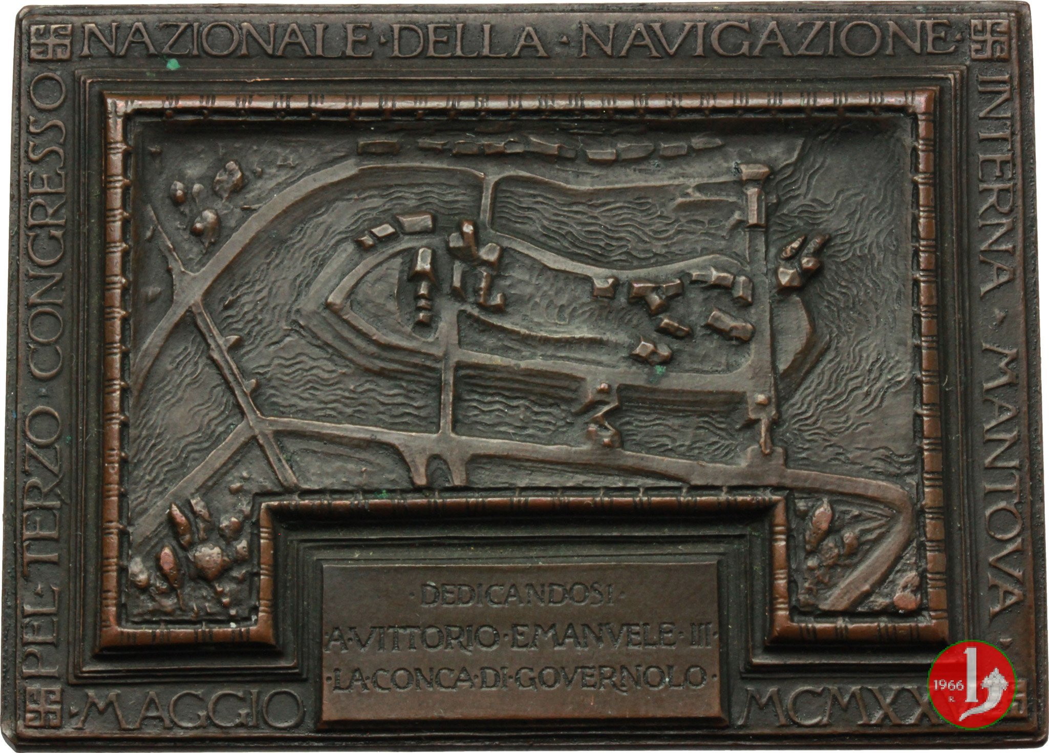 3° Congresso Nazionale Navigazione Interna 1925 Dritto: PEL • TERZO • CONGRESSO _ NAZIONALE • DELLA • NAVIGAZIONE _ INTERNA • MANTOVA entro doppia cornice: vista planimetrica dell'Isola Tiberina in basso entro targa: • DEDICANDOSI • = • A • VITTORIO • EMANVELE • III • = • LA • CONCA • DI • GOVERNOLO • in basso ai lati: • MAGGIO _ MCMXXV • entro doppia cornice: Virgilio in piedi e volto a sx e sullo sfondo la Città di Mantova in basso a dx: S. JOHNSON sotto al centro: stemma in cartiglio della Città di Mantova | |