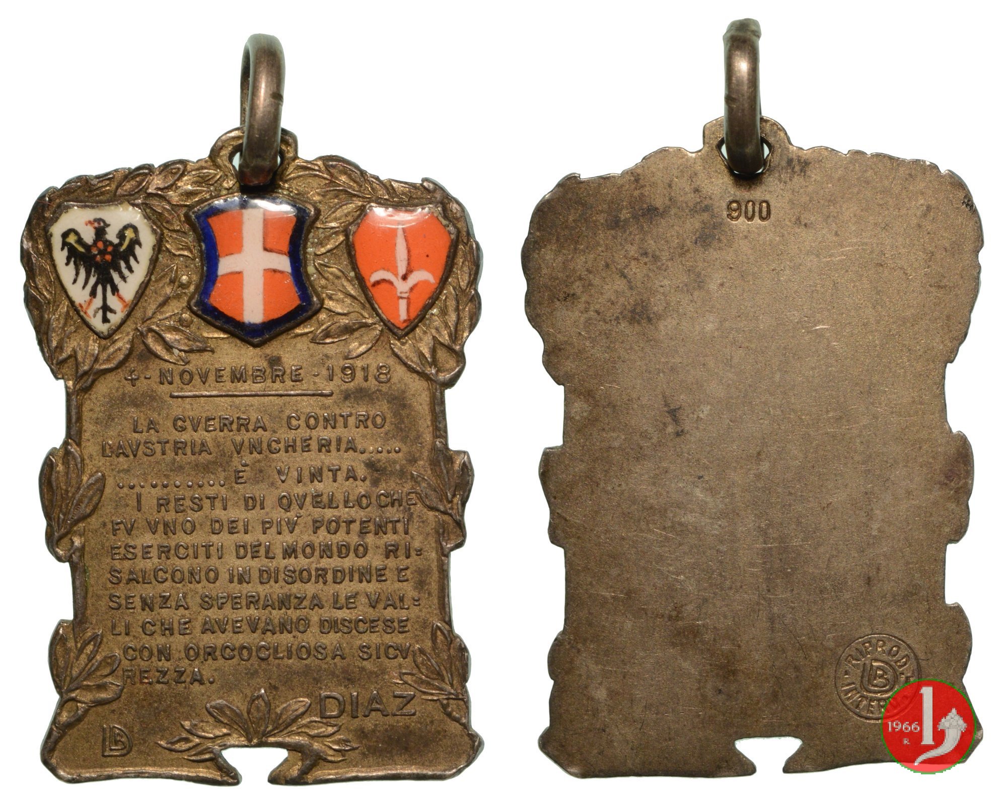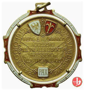 Liberazione di Trento e Trieste Dritto: VITTORIO _ EMANUELE III busto a dx con uniforme nel campo, entro cordone annodato ai lati e sormontato dagli Stemmi a smalto delle due Città, su grande stella: FEDE E MARTIRIO = ACCESERO = LE VIE ALLA LIBERTA = RESSERO = ALLA VITTORIA IL VOLO sotto, entro cartella a smalto bianco: PAX in basso, a sx: RIP. INT. | |