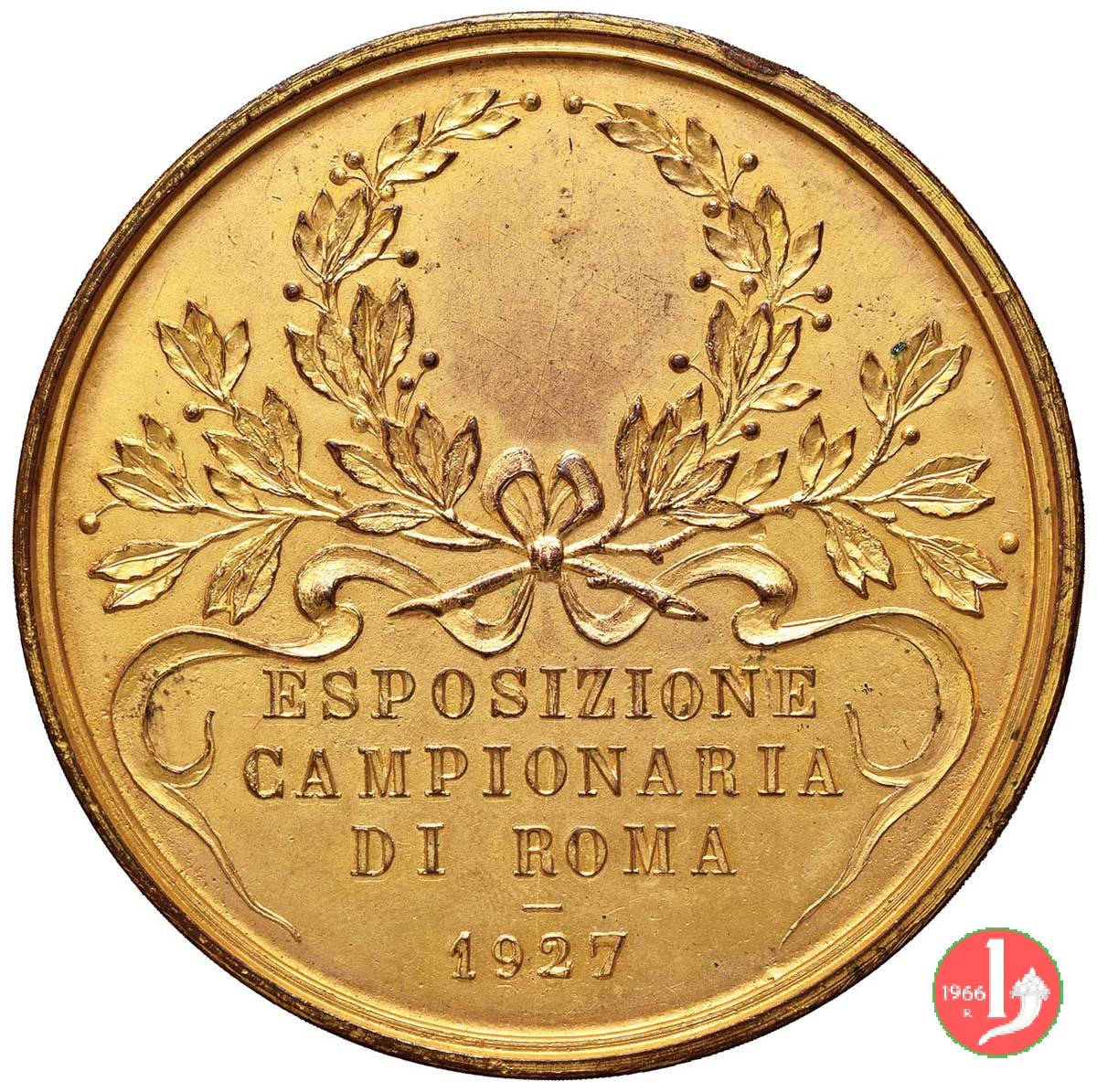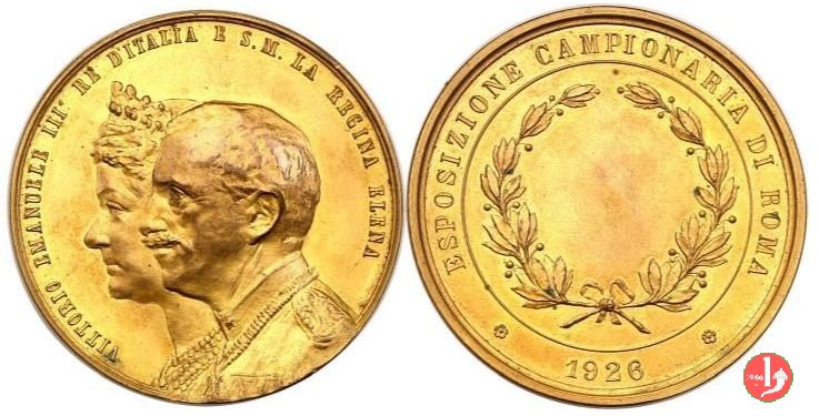 Esposizione Campionaria di Roma 1926 Dritto: VITTORIO EMANUELE III° RE D'ITALIA E S. M. LA REGINA ELENA busti accollati a sx di Vittorio Emanuele III con divisa militare e collare della SS. Annunziata e della Regina Elena diademato con collana di perle entro cerchio continuo: rami d'alloro legati in basso da nastro con spazio centrale per dedica | |